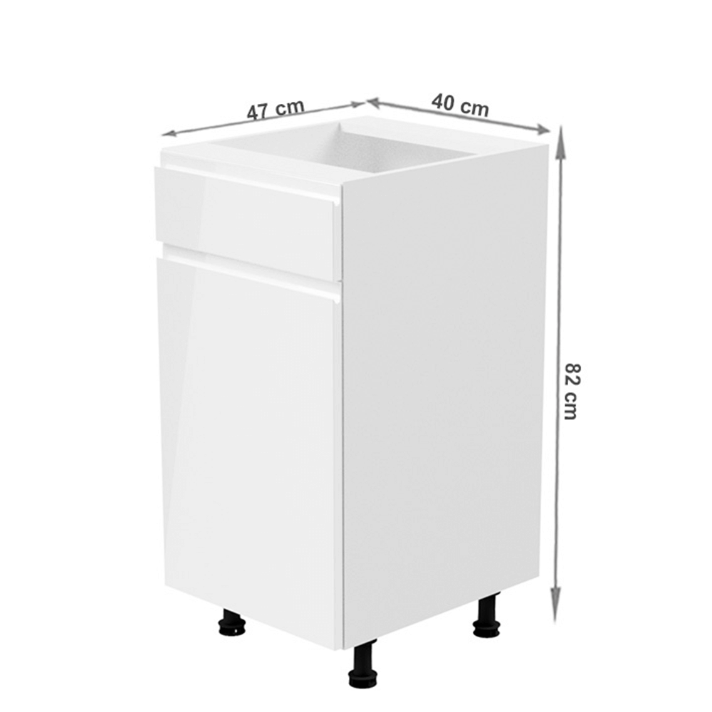 Spodní skříňka D40S1 je s jedněmi dvířky a jedním šuplíkem. Vnitřní prostor je jednou policí rozdělen na dvě odkládací plochy. Dvířka jsou bez úchytky a otevírají se do levé strany.
