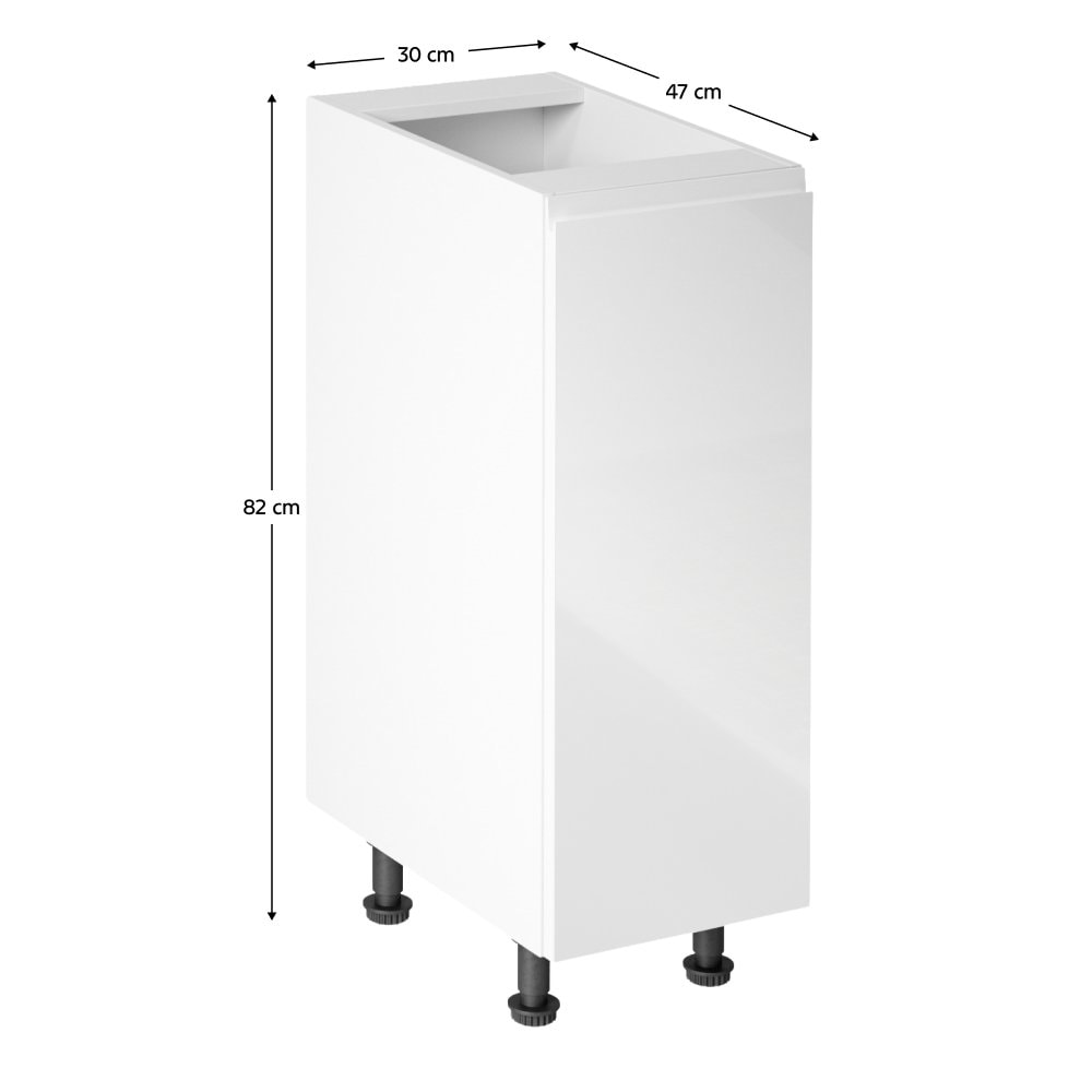 Spodní skříňka D30 je s jedněmi dvířky. Vnitřní prostor je jednou policí rozdělen na dvě odkládací plochy. Dvířka jsou bez úchytky a otevírají se do levé strany.