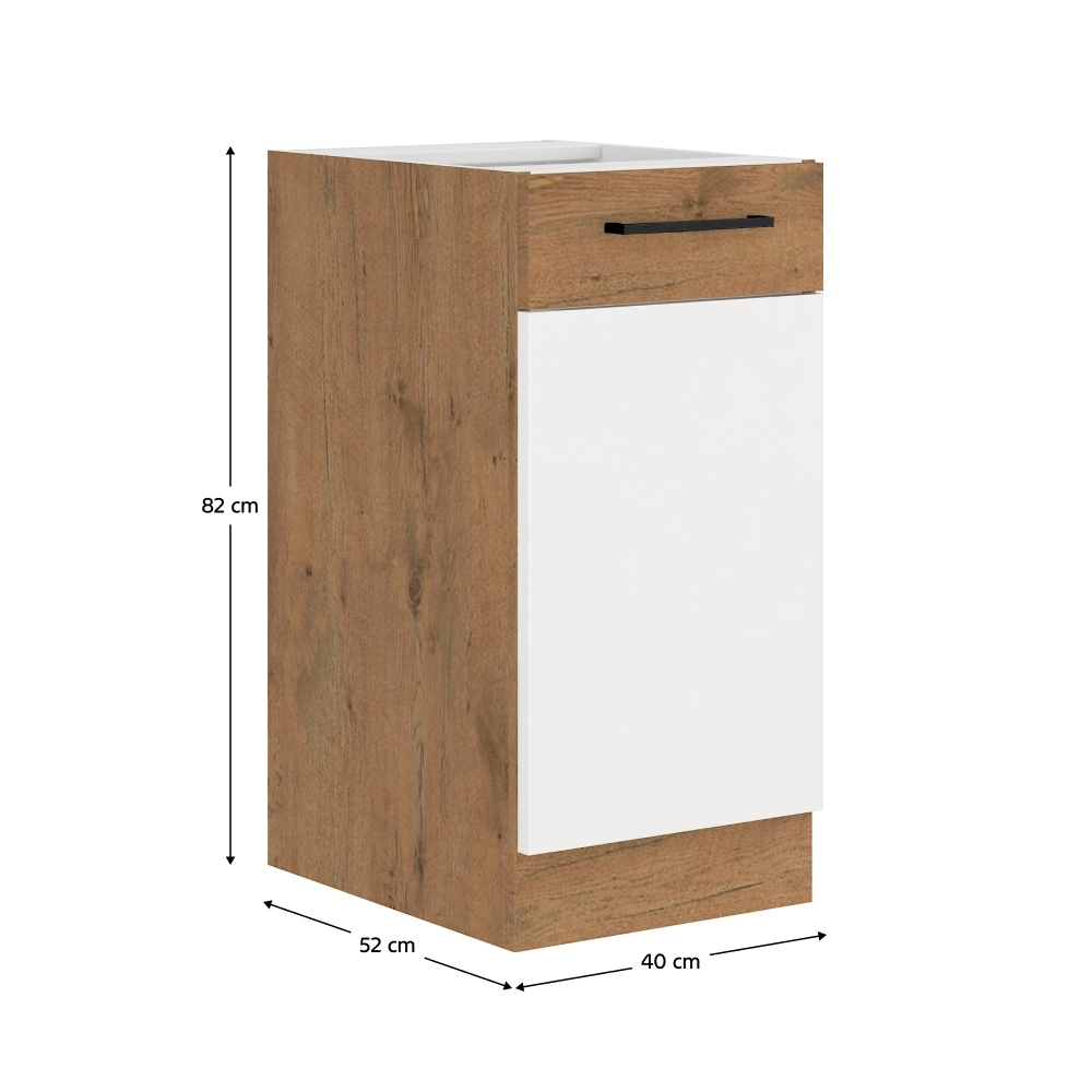 Spodní skříňka VEGA D40 1F BB Materiál: DTD laminovaná / MDF Barva: bílá extra vysoký lesk HG / dub lancelot Rozměry (ŠxHxV): 60x52x82 cm Skříňka bez pracovní desky Systém tichého zavírání dvířek Včetně spodní lišty Dodávané v demontu Spodní skříňky jsou dodávány včetně dolní lišty, bez pracovní…