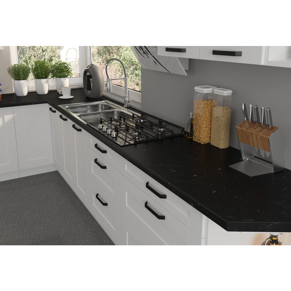 Pracovní desku o tloušťce 3,8 cm si můžete doobjednat v provedení dub artisan nebo marmur roma.
