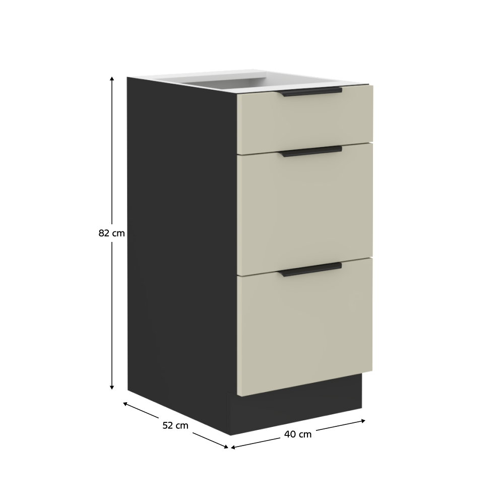 Dolní skříňka ARAKA 40 D 3S BB je se třemi šuplíky v kombinaci cashmere s černou. Skříňka je dodávána s dolní lištou a bez pracovní desky.