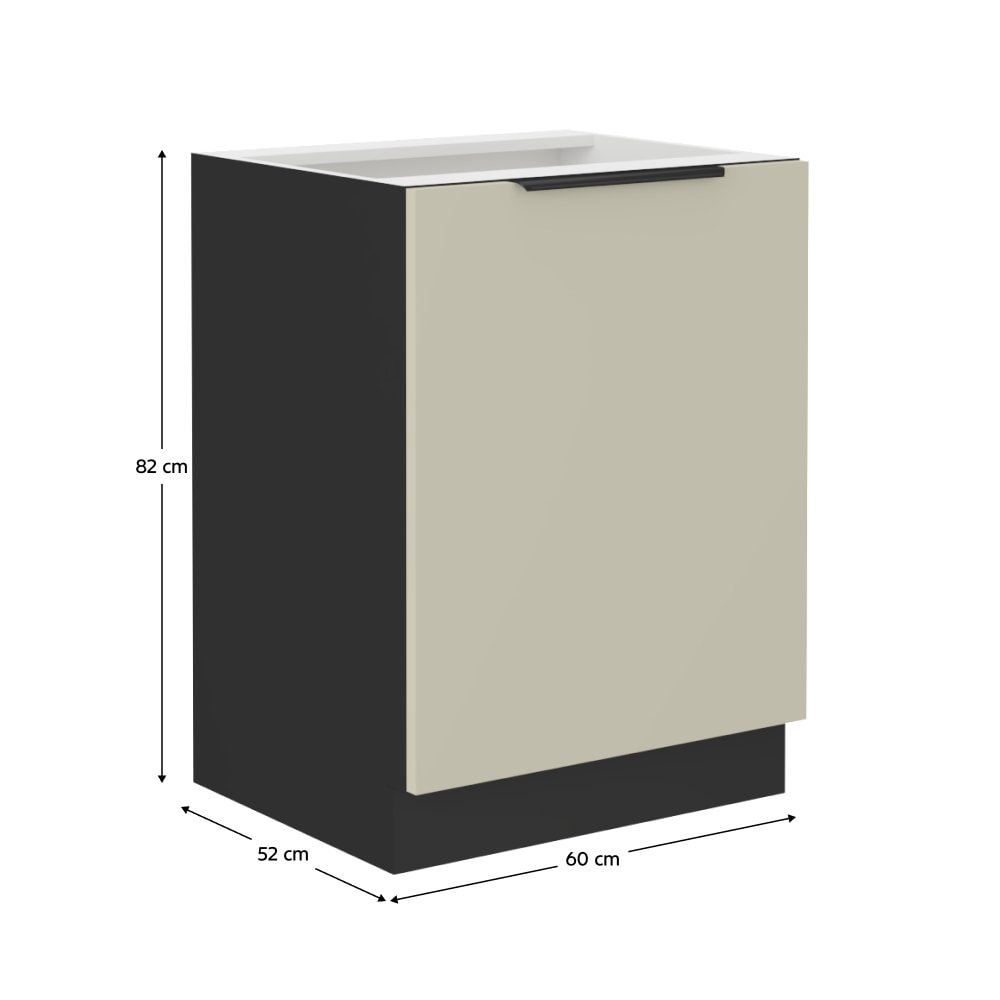 Materiál: laminovaná DTD Barva dvířek: cashmere Barva korpus: černý mat Rozměry (ŠxHxV): 60x52x82 cm Tloušťka materiálu: 1,6 cm S dvířky Policová S úchytkou Barva úchytky: aluminiová Bez pracovní desky S dolní lištou/soklem Systém tichého zavírání dvířek Moderní design Možnost dokoupit univerzální…
