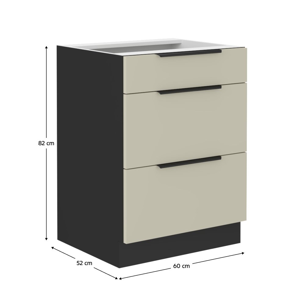 Dolní skříňka ARAKA 60 D 3S BB je se třemi šuplíky v kombinaci cashmere s černou.