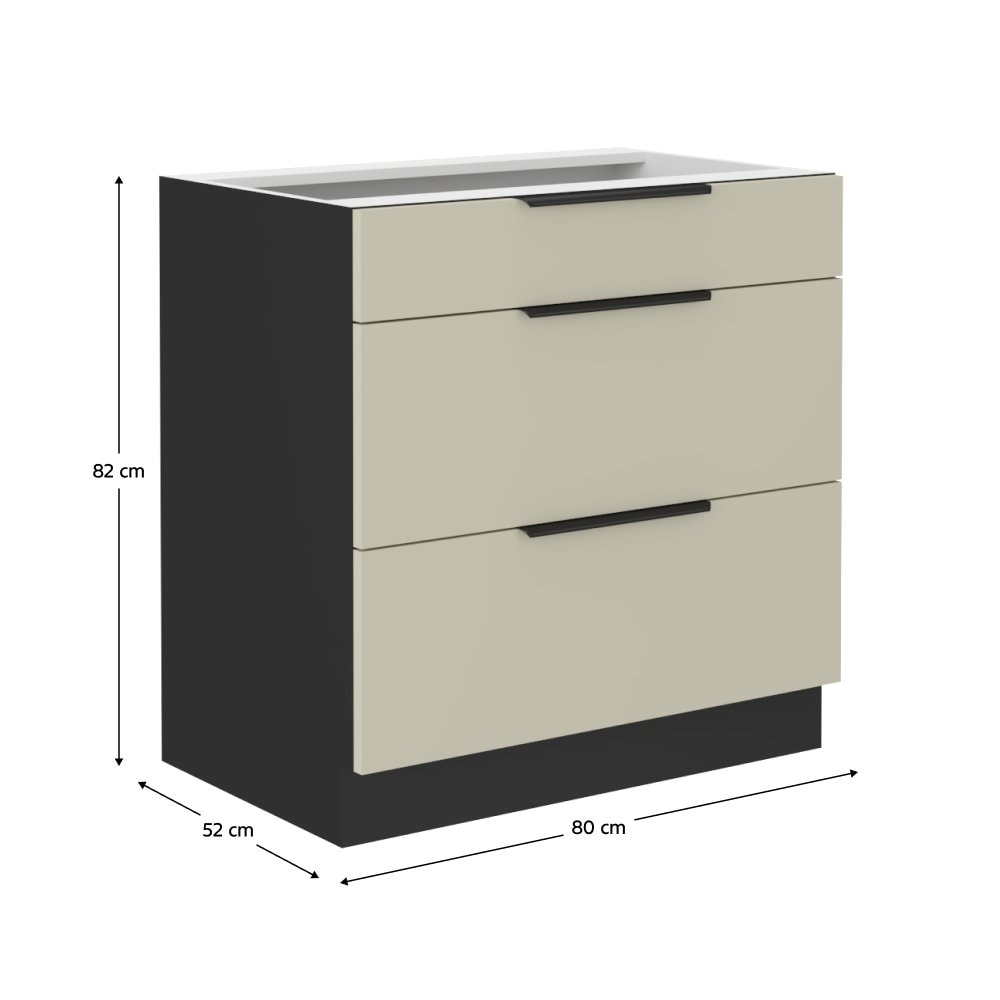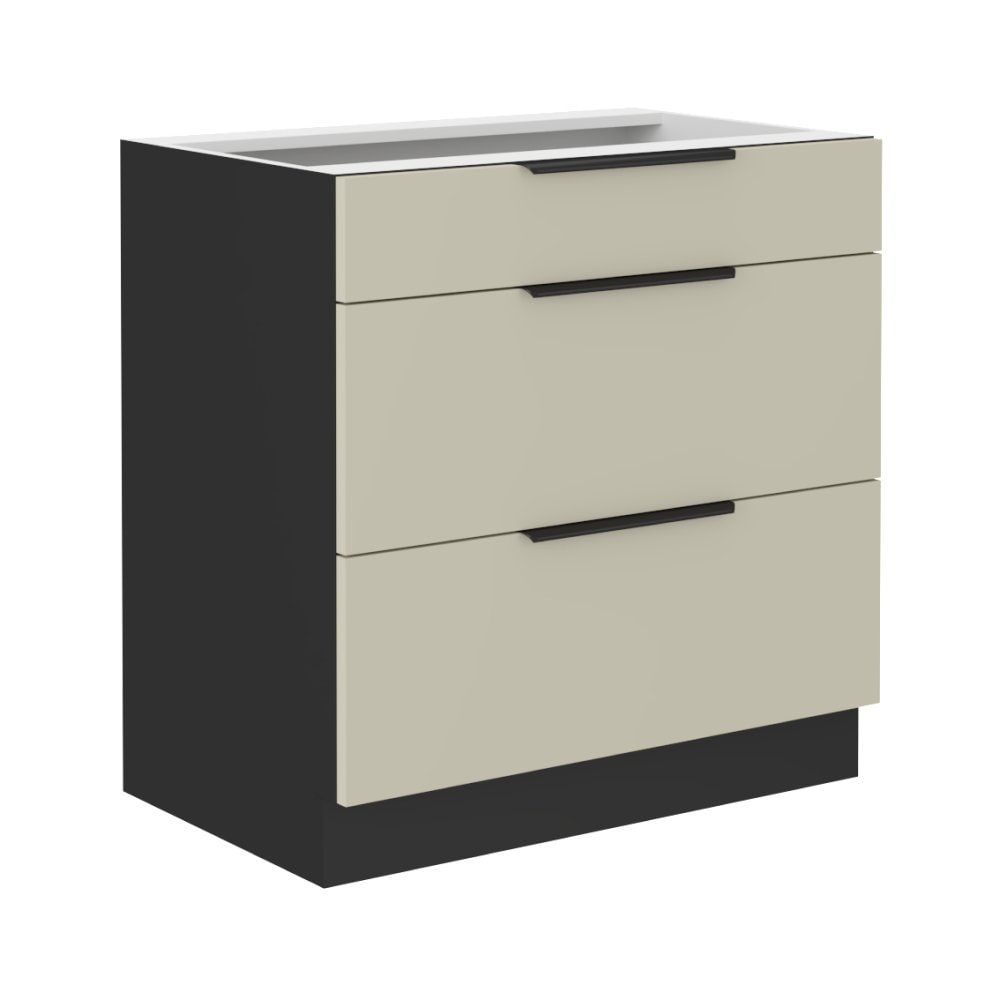 Dolní skříňka ARAKA 80 D 3S BB je se třemi šuplíky v kombinaci cashmere s černou.