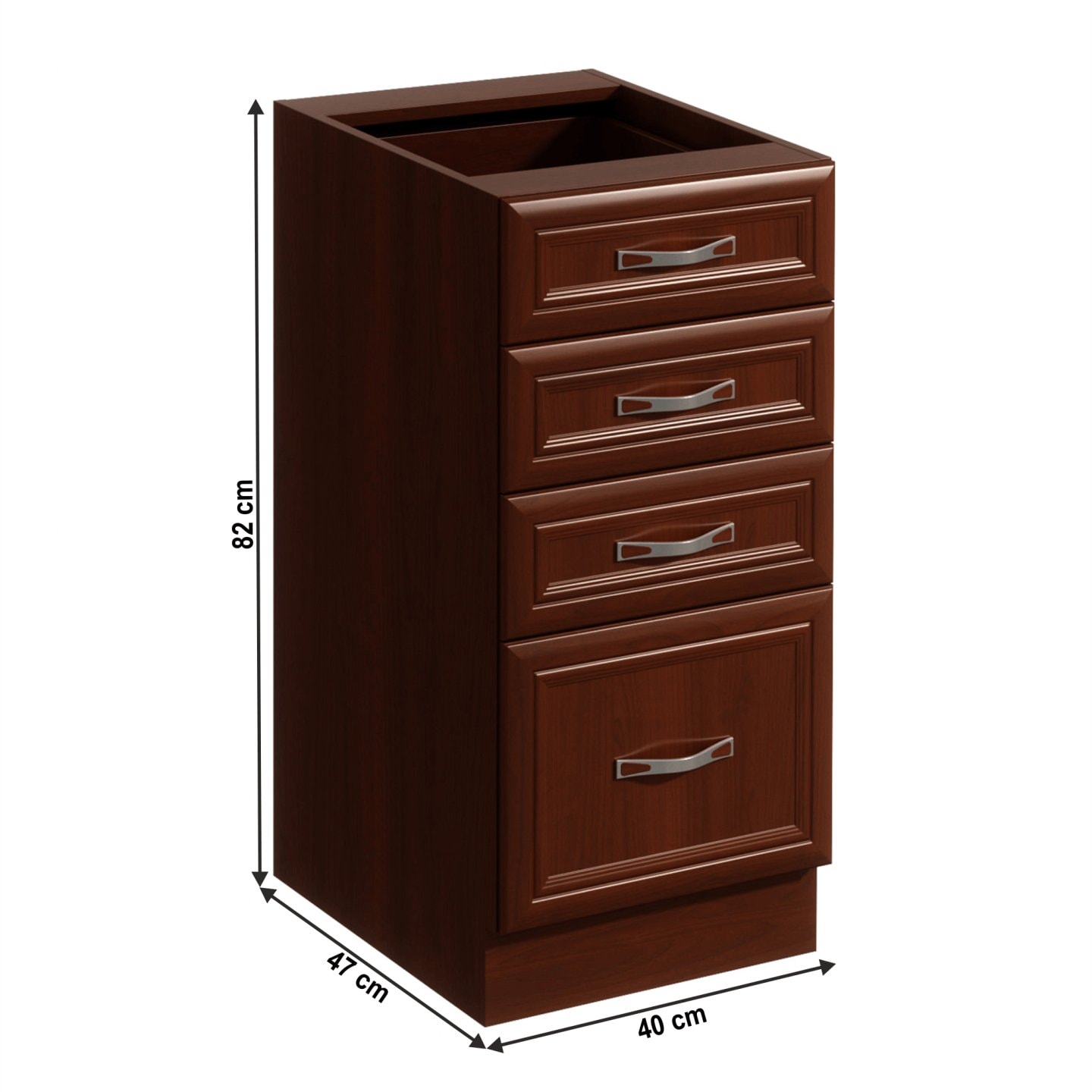 Spodní skříňka D40S4 s šuplíky ke kuchyni SICILIA Provedení: DTD laminovaná/MDF lišty Barva: ořech Milano Rozměry (ŠxHxV): 40x47x82 cm Tloušťka materiálu: 15 mm Spodní skříňky jsou dodávány bez pracovní desky. Můžete si objednat pracovní desku pískovec k provedení ořech Milano - tloušťka 28mm za 1…