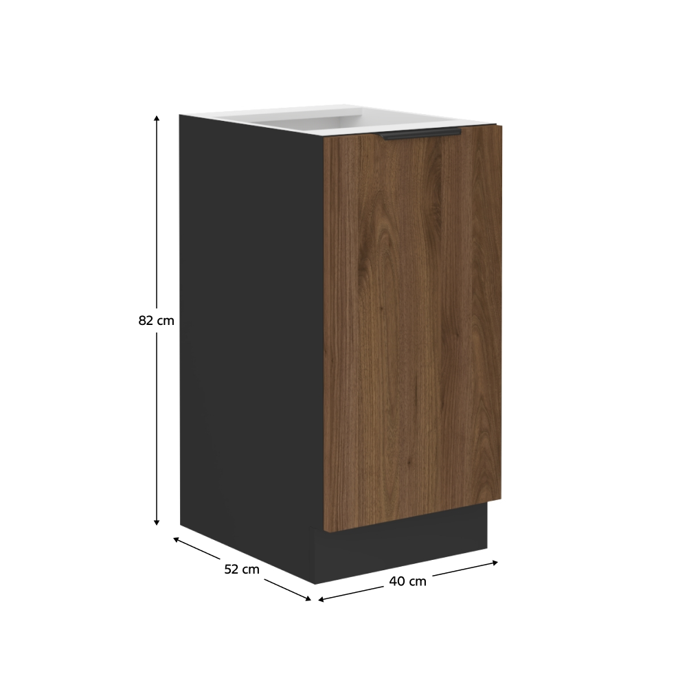 Dolní skříňka MENZO 40 D 1F BB je s dvířky v kombinaci ořech okapi s černou.