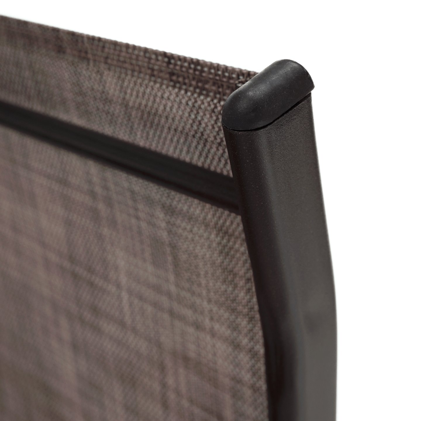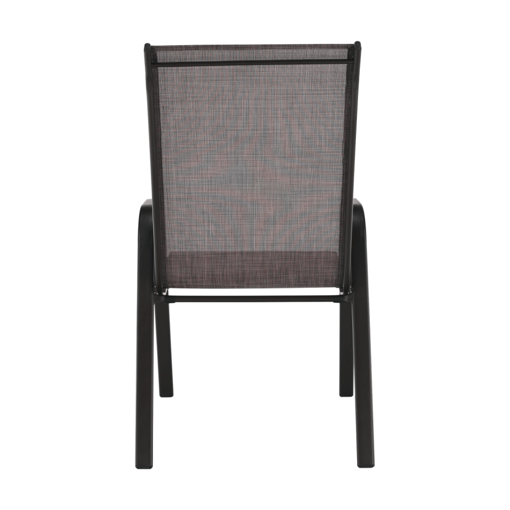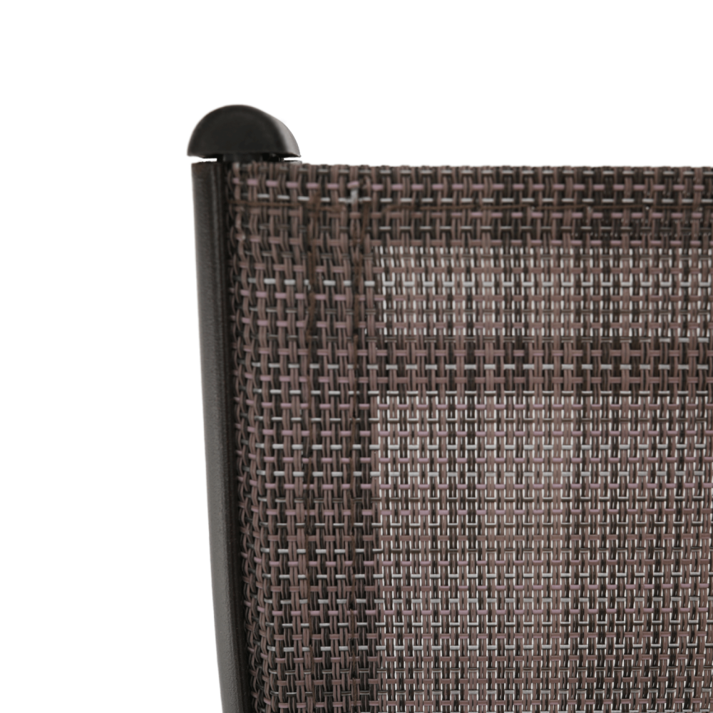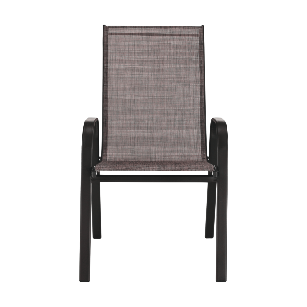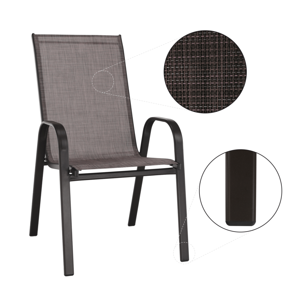 Tato židle je osvěžující změnou do zahrady nebo na terasu. Sedací a opěradlová část je z hnědé látky, pevná a stabilní konstrukce je z hnědé oceli. Můžete ji snadno kombinovat se stoly z naší nabídky.