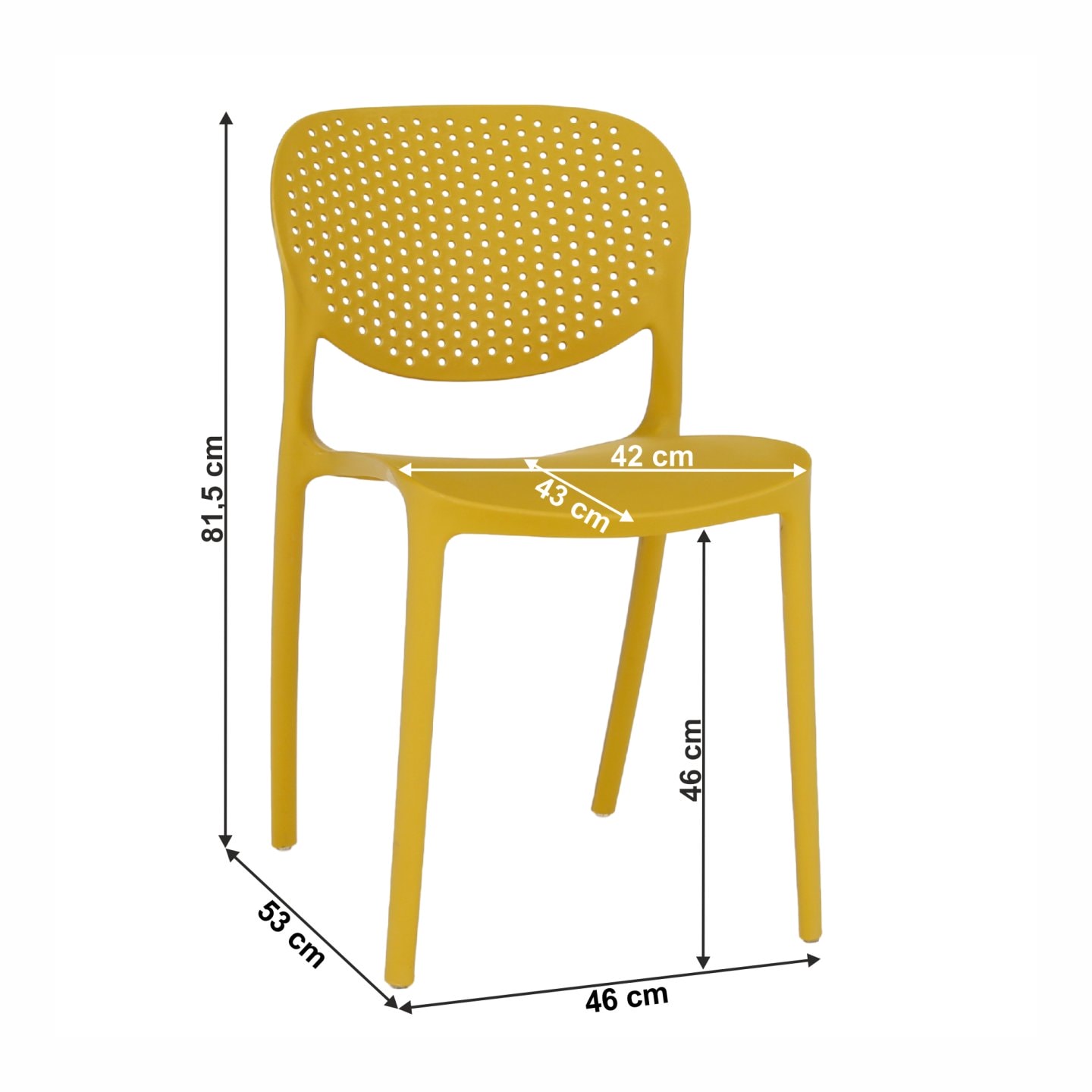 Materiál: plast Barva: žlutá Rozmery (ŠxHxV): 46x53x81,5 cm Výška sedu: 46 cm Hloubka sedu: 43 cm Šířka sezení: 42 cm Nosnosť: 90 kg Stohovateľná Vhodná do interiéru aj exteriéru Dodávané v monte