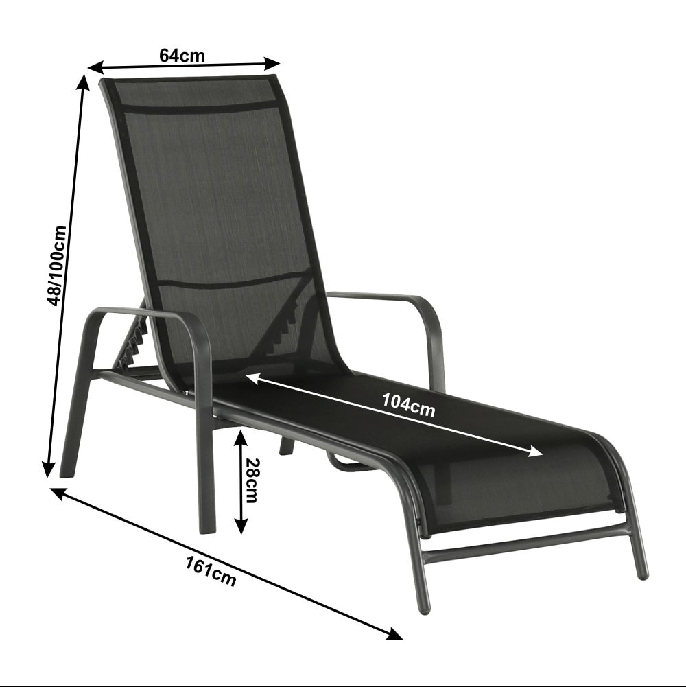 Materiál: látka / kov Provedení: černá / šedá Rozměry (ŠxHxV): 64x161x48 / 100 cm Výška sedu: 28 cm Hloubka sedu: 104 cm Celková hloubka po sklopení: 195 cm Nosnost: 90 kg polohovací Stohovatelné S područkami Dodávané v demontu.