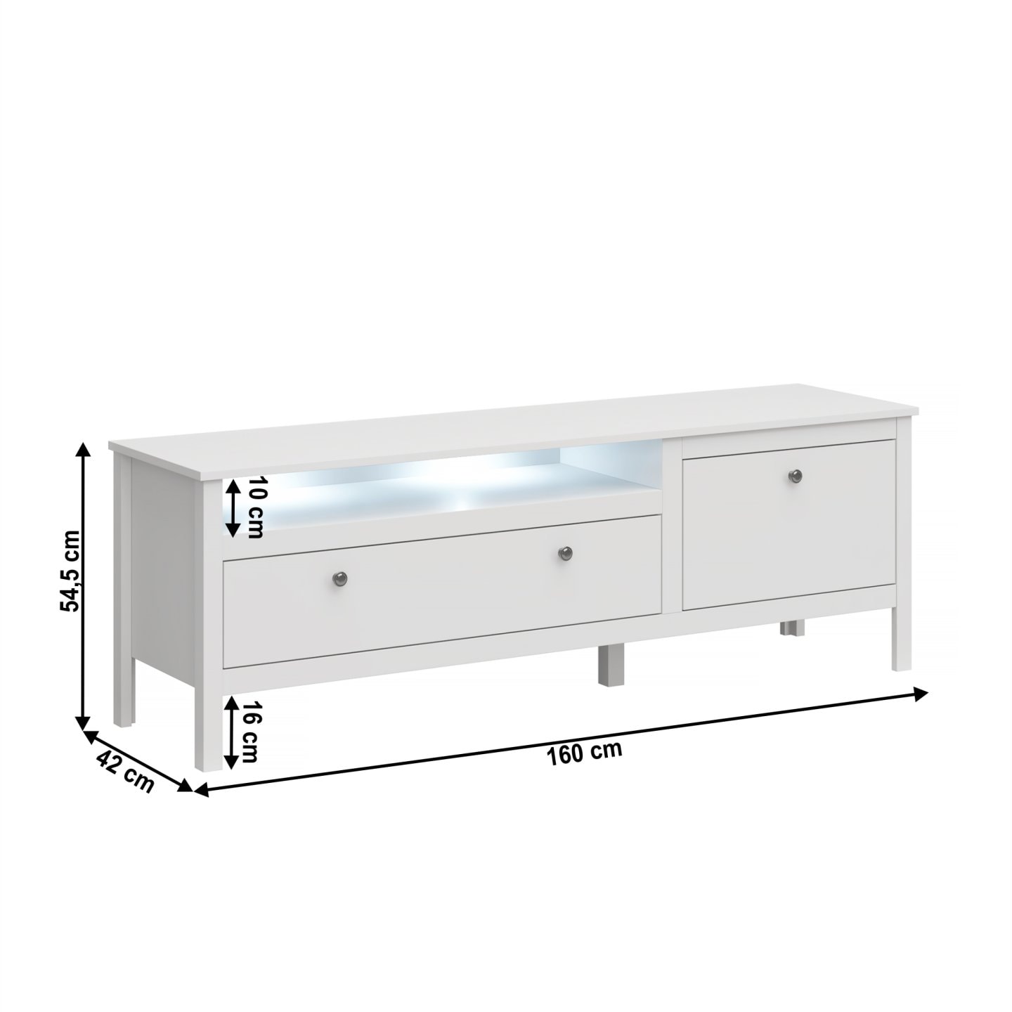 Materiál: DTD laminovaná/ABS hrany/MDF Barva: bílá Rozměry(ŠxHxV): 160x42x54,5 cm Výška nožiček: 16 cm Tloušťka materiálu: 1,6 cm Jedna skříňka s výklopem Jeden šuplík Otevřený úložný prostor Výška otevřeného prostoru: 10 cm Bez LED osvětlení Možnost dokoupení LED osvětlení MDF dvířka Dodáván v demontu