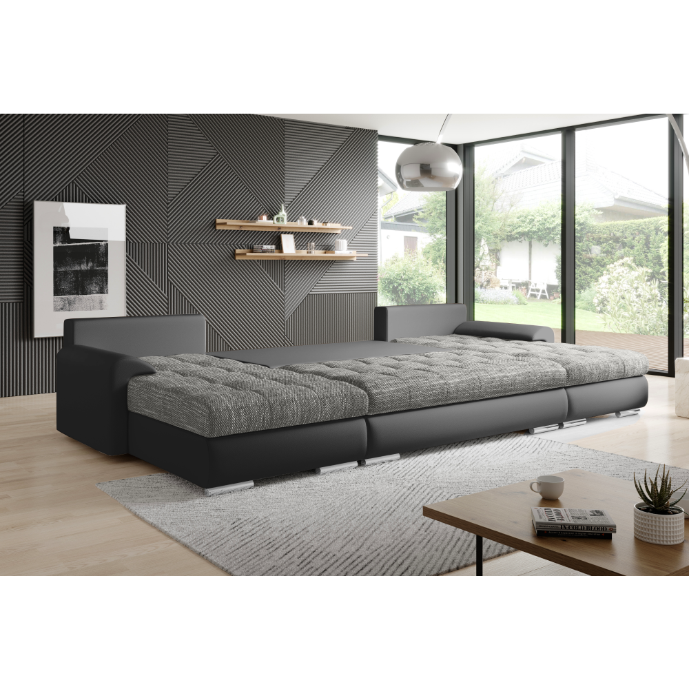 Objevte dokonalý relax s naší univerzální a rozkládací sedací soupravou TOLITA U UNI, která přináší maximální pohodlí a stylový design do vašeho domova. Tato souprava je ideální pro větší rodiny či návštěvy, nabízí komfortní sezení a v případě potřeby se jednoduše přemění na prostorné lůžko k občasnému přespání nebo líná nedělní odpoledne. Praktický úložný prostor poskytuje dostatek místa na uskladnění věcí, čímž šetří prostor ve vaší domácnosti. Kombinace látky Berlin v melírované šedé a černá ekokůže vytváří luxusní dojem, který udělá z vašeho obývacího pokoje místo plné stylu. Pohodlí zvyšuje výplň z pružiny falista a PUR pěny, která zaručuje oporu a komfort při sezení i ležení. Součástí jsou polštáře, které nejen dotváří její moderní vzhled, ale slouží i jako pohodlná opora zad. Díky celočalouněnému provedení ji můžete umístit i do prostoru, kde se stane dominantou vašeho obývacího pokoje. Sedací souprava je postavena na plastových nožičkách ve stříbrné barvě, které zajišťují stabilitu a elegantní vzhled.