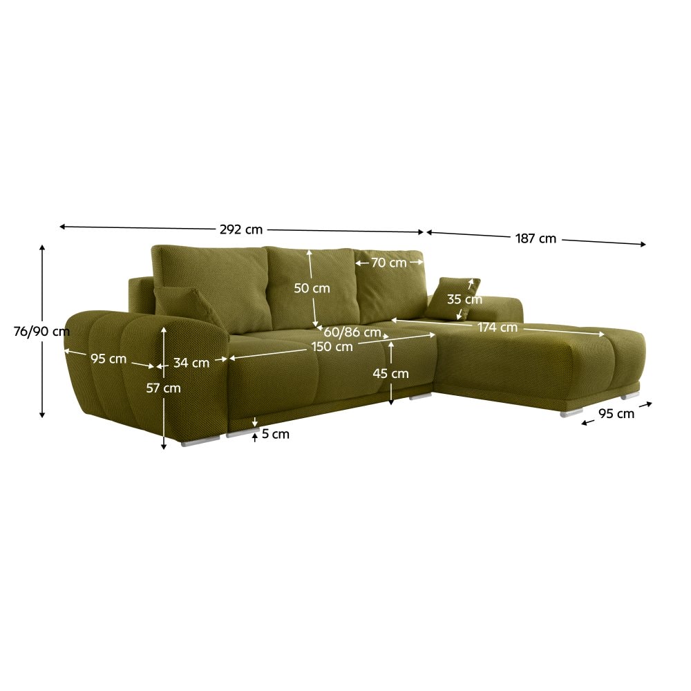 Materiál: látka Curio 35 Oděruodolnost textilie podle testu Martindale: 60 000 oděrů Barva: olivová Rozměry (ŠxHxV): 292x187x76/90 cm Plocha na spaní (ŠxD): 135x225 cm Výška sedu: 44 cm Hloubka sedu: 60/86 cm Rozměry otomanu (ŠxH): 95x174 cm Rozměry opěrky na ruku (ŠxHxV): 34x95x57 cm Šířka sedáku:…