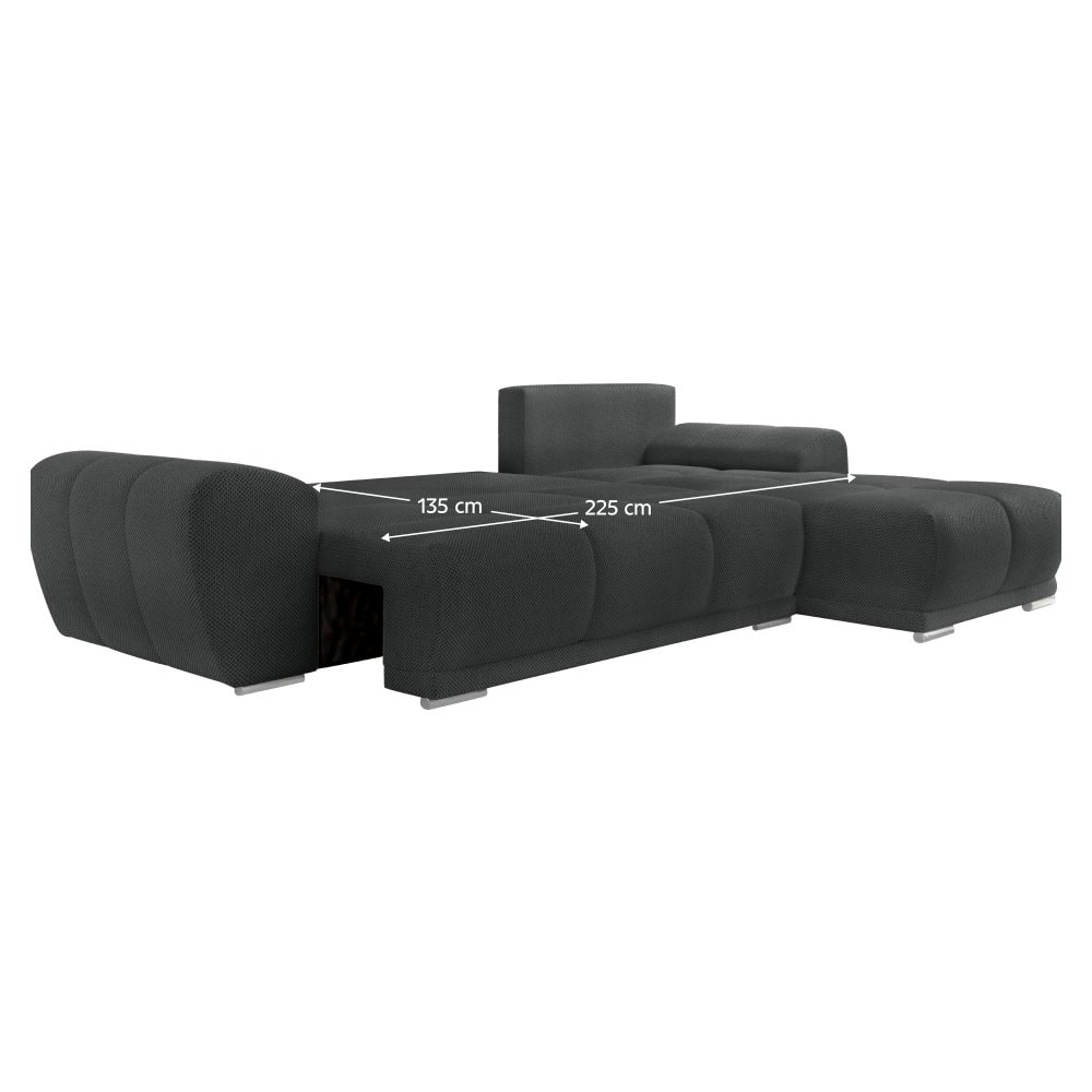 Je celočalouněná látkou Curio v barevném provedení tmavě šedá. Nebojte se ji umístit do prostoru a nechat tak vyniknout její krásu. Je univerzální, což znamená, že ji můžete umístit v levém nebo pravém provedení dle vašich potřeb. Maximální komfort sezení zajišťuje výplň z vlnovcových pružin a PUR pěny. Velkým plusem sedací soupravy je úložný prostor, kde umíte prakticky uložit všechny deky a polštáře, které v dané chvíli nepotřebujete. Vyniká funkcí rozkladu, která se postará o plnohodnotný odpočinek a relaxaci s komfortní plochou na spaní. Součástí sedací soupravy jsou i polštáře, které se postarají o pohodlné opření zad. Stojí na stříbrných plastových nožičkách, které sedačce KERIM ROH dodávají eleganci a styl.
