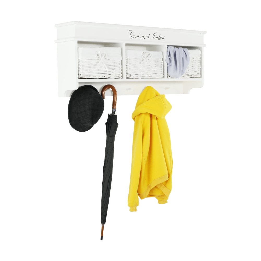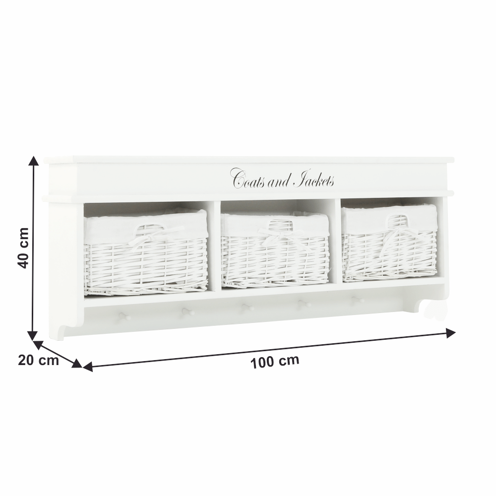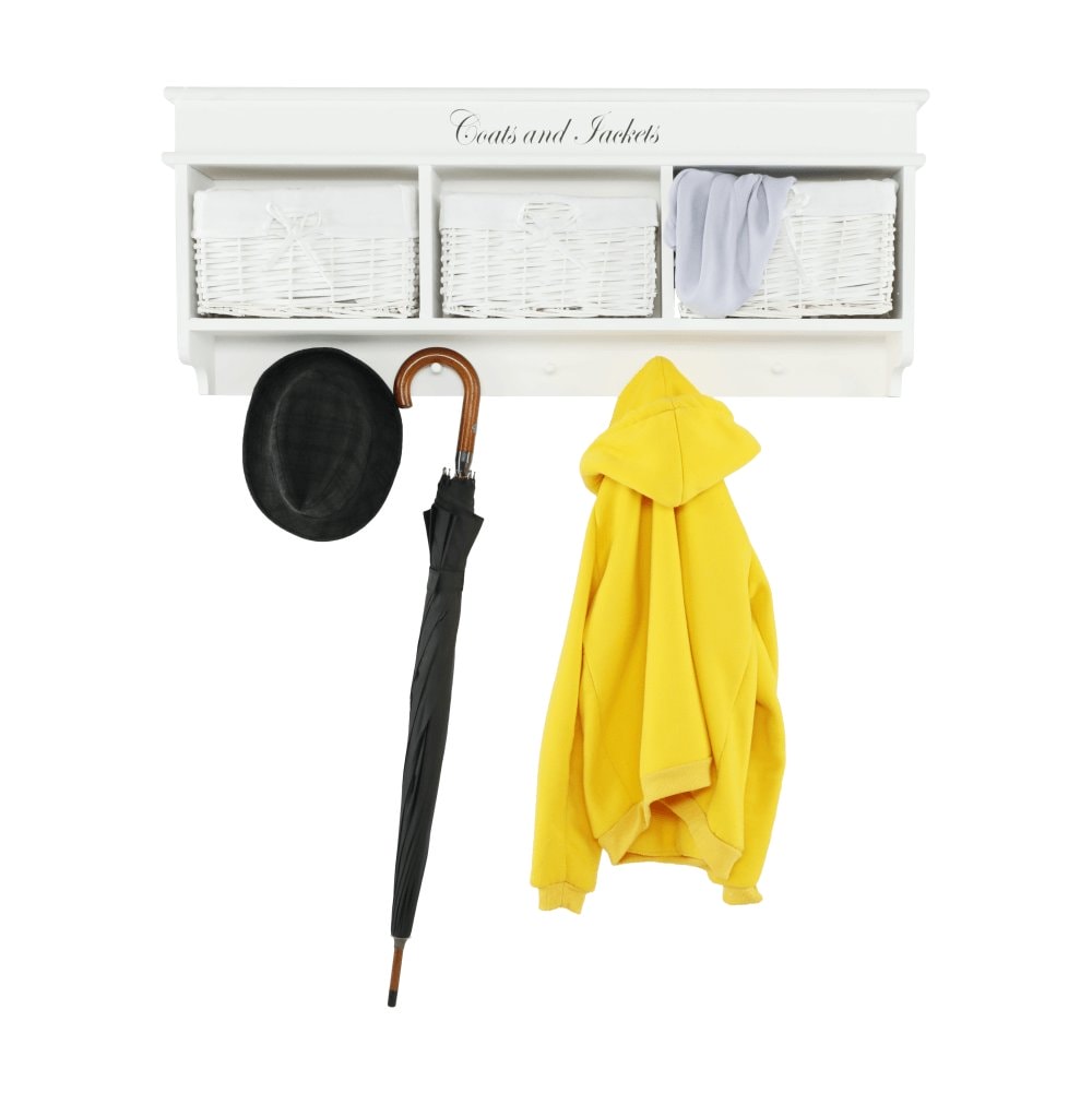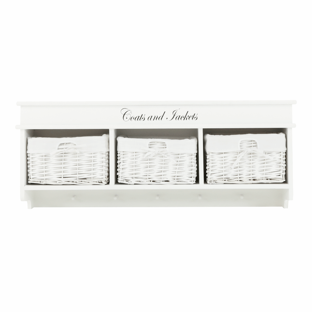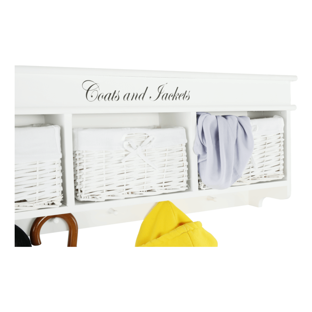 Dřevěný věšák s nápisem na pevném rámu a se 3 proutěnými košíky v bílém provedení.