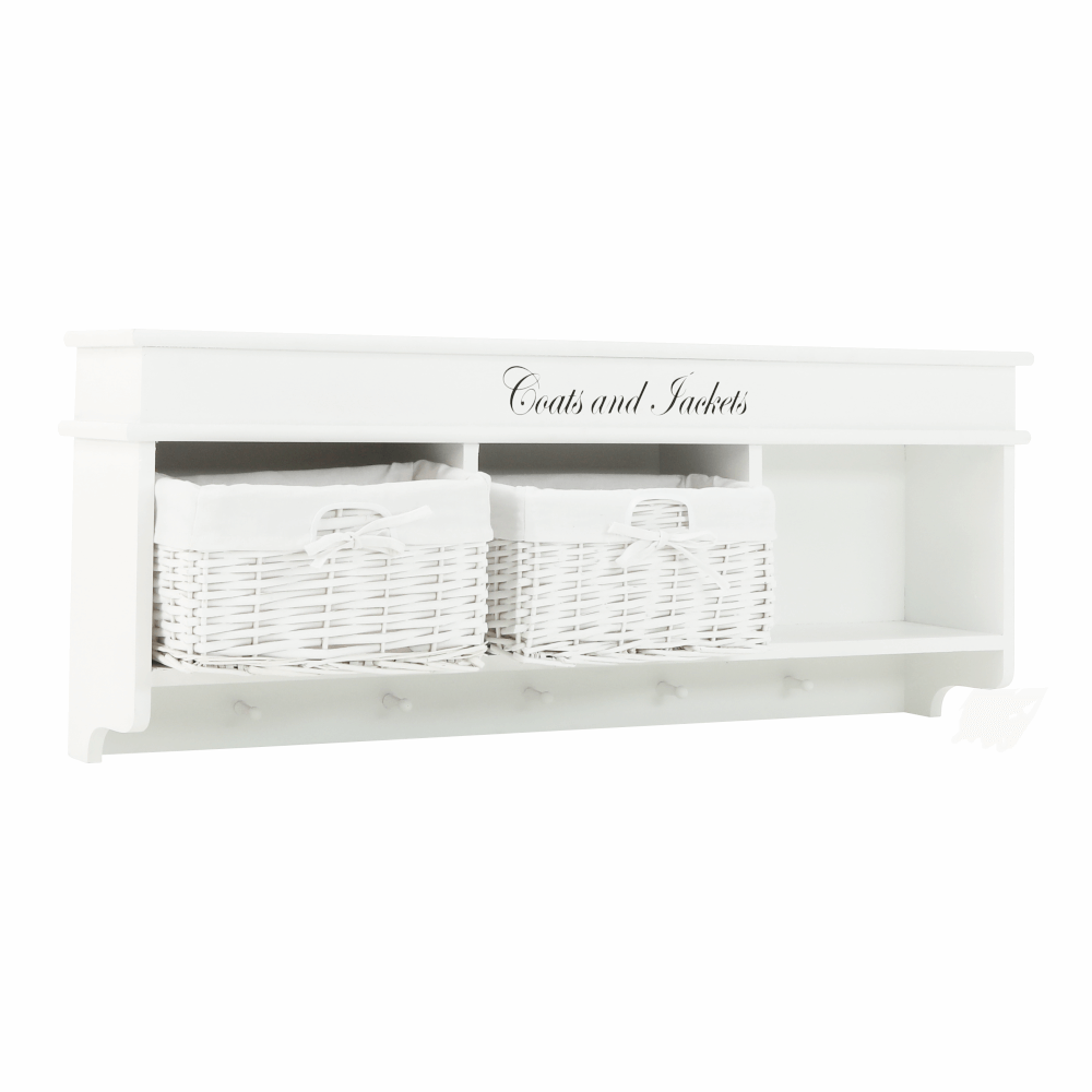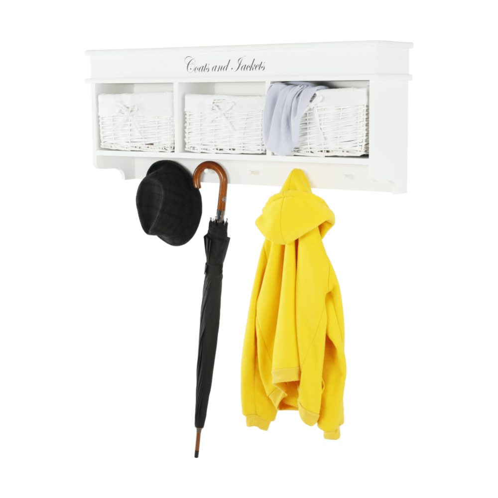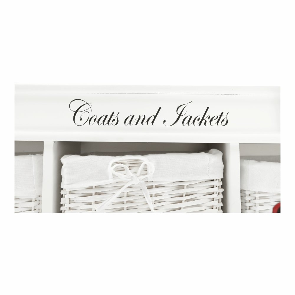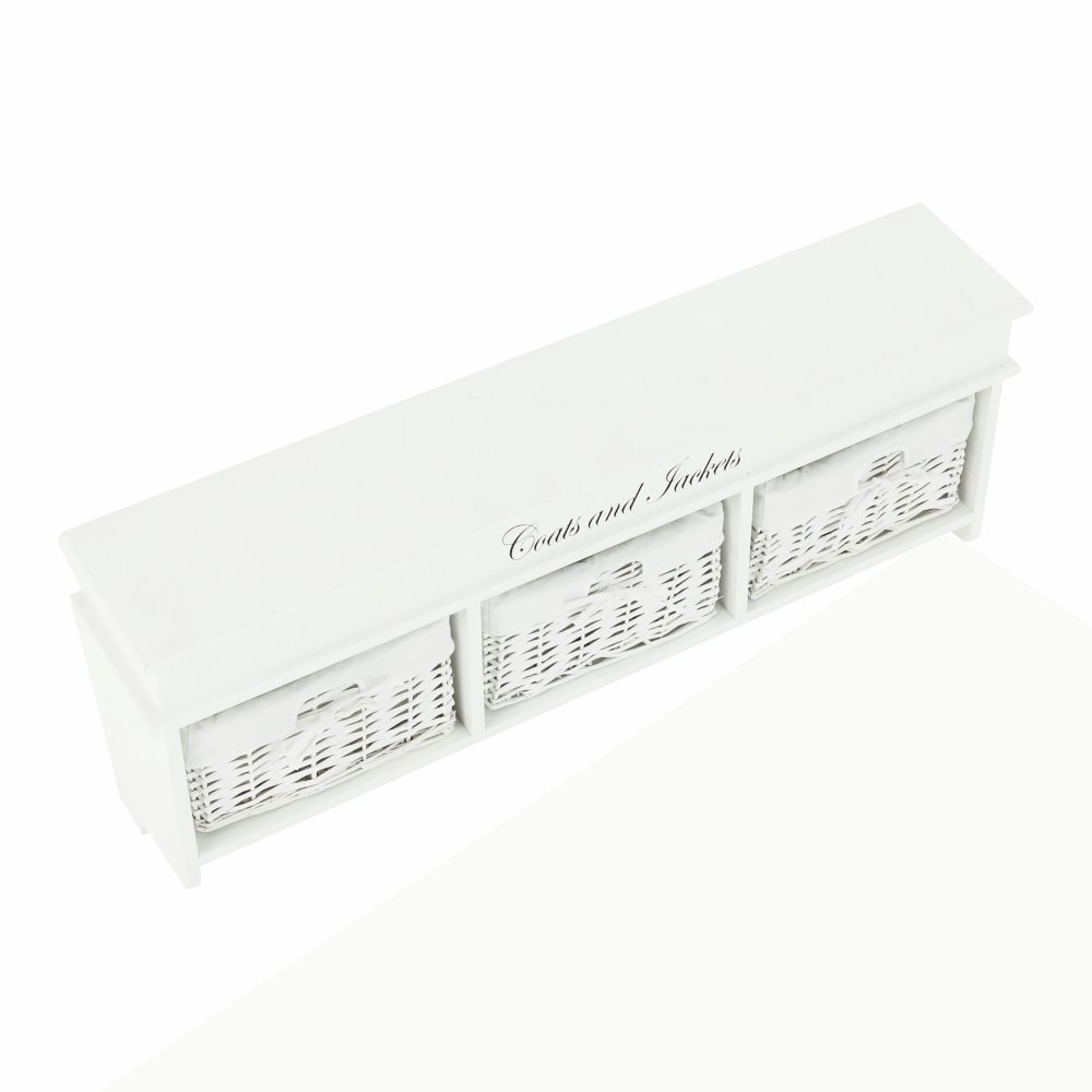Dřevěný věšák s nápisem na pevném rámu a se 3 proutěnými košíky v bílém provedení.