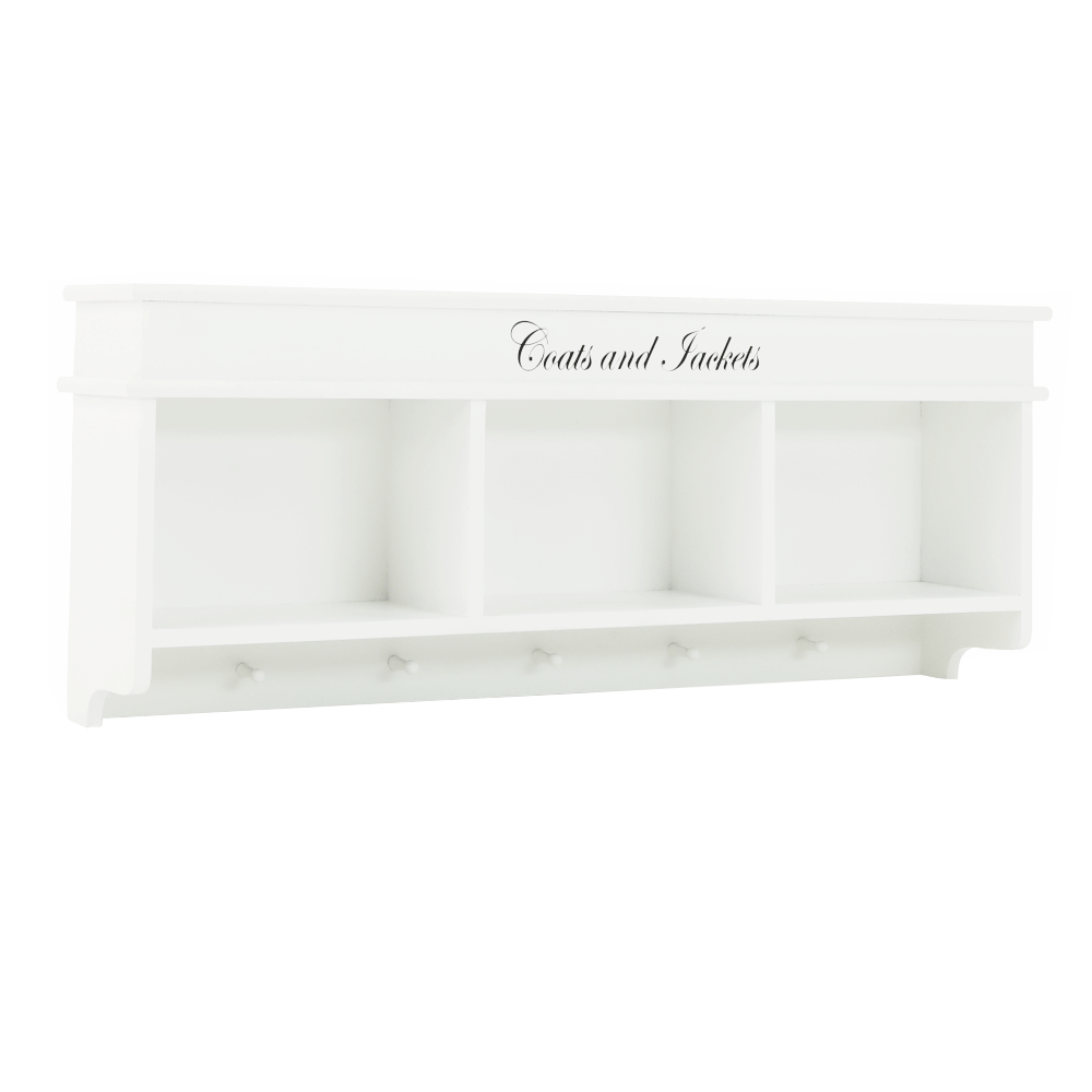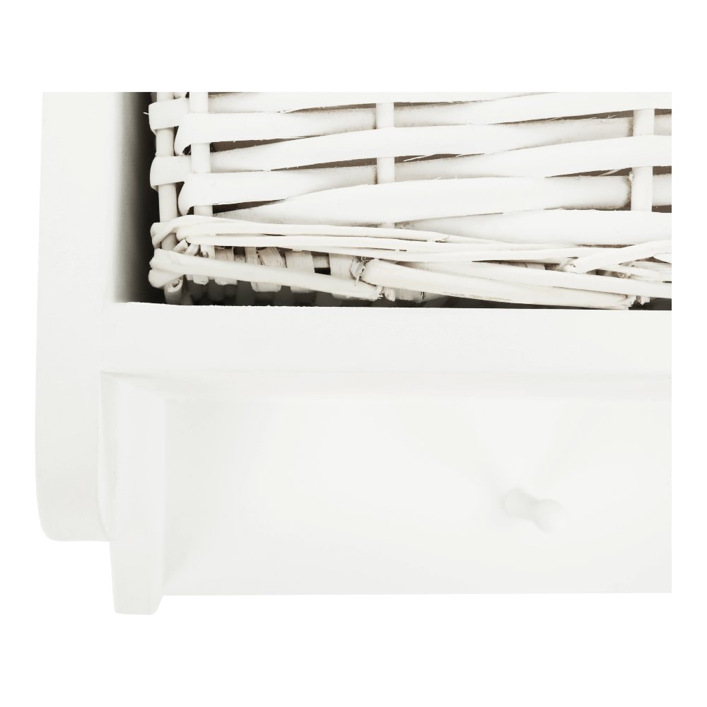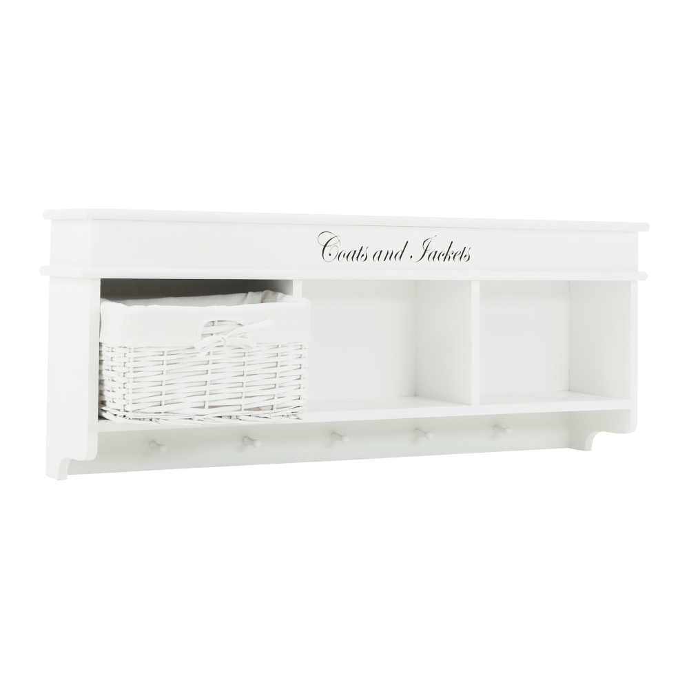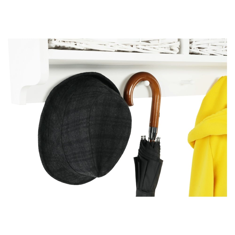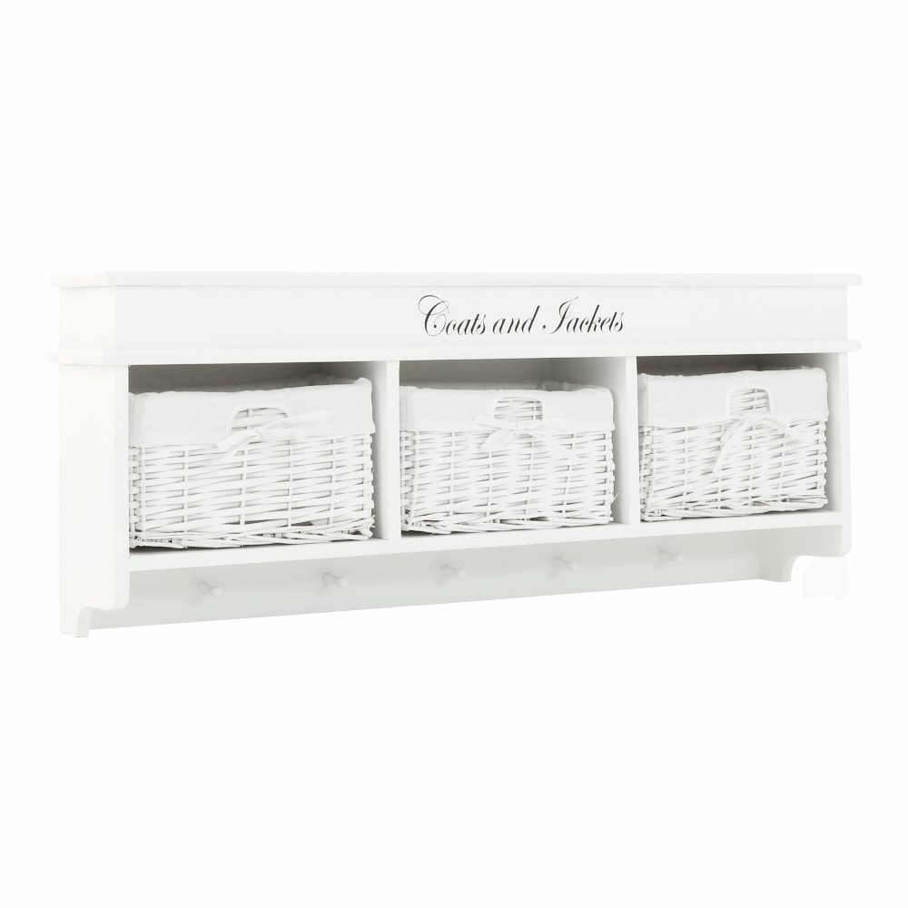 Dřevěný věšák s nápisem na pevném rámu a se 3 proutěnými košíky v bílém provedení.