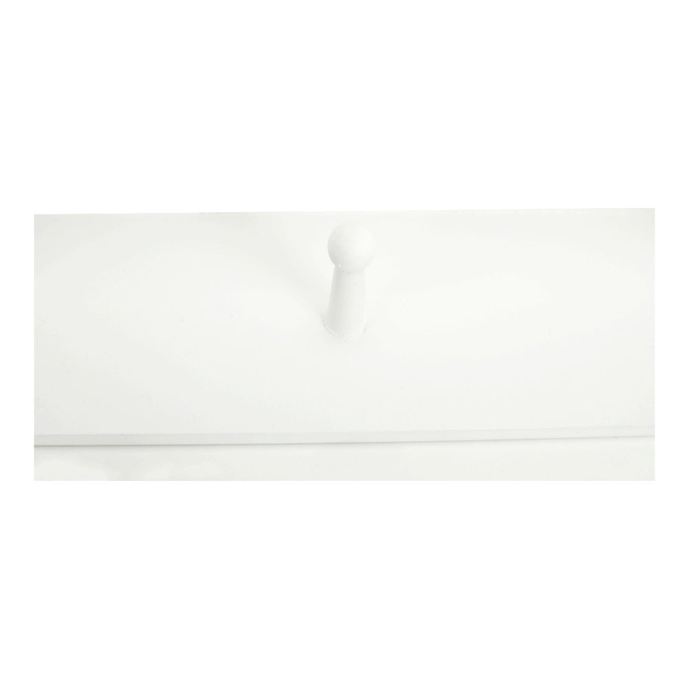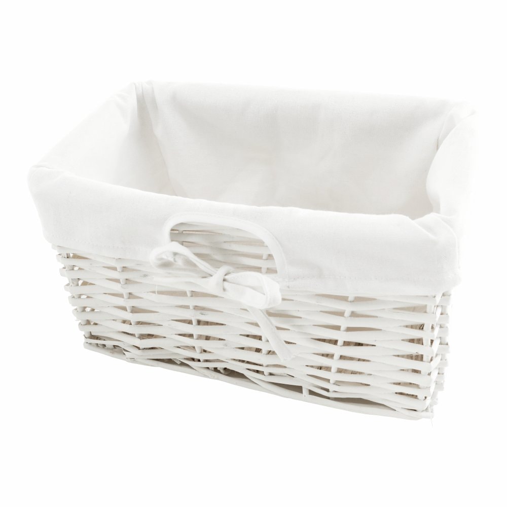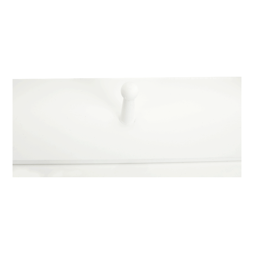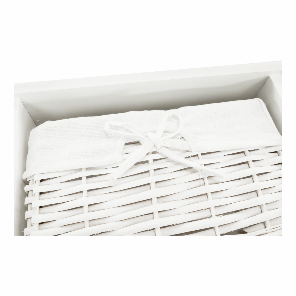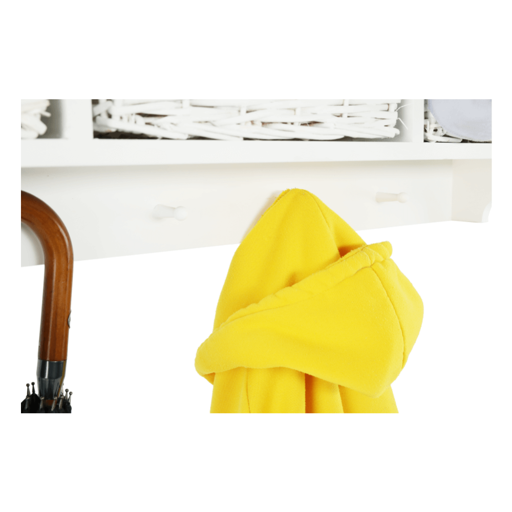 Dřevěný věšák s nápisem na pevném rámu a se 3 proutěnými košíky v bílém provedení.
