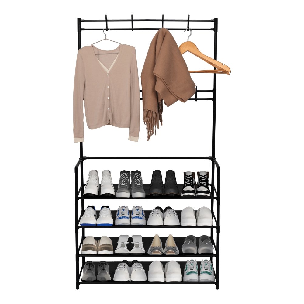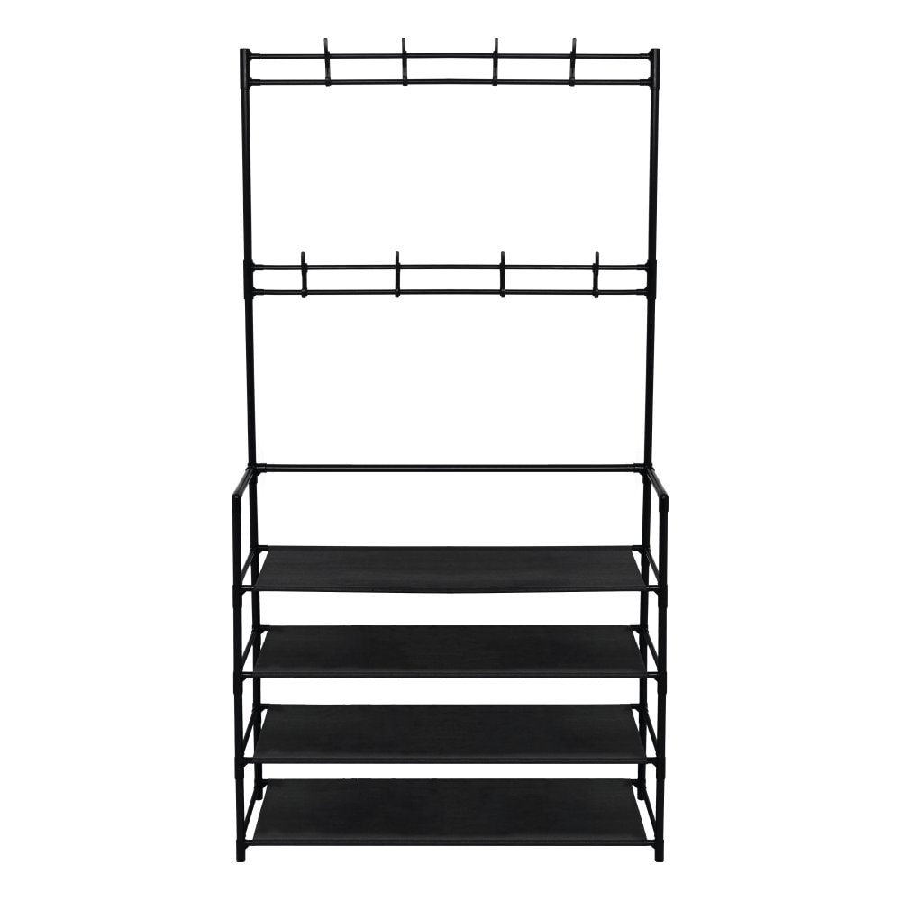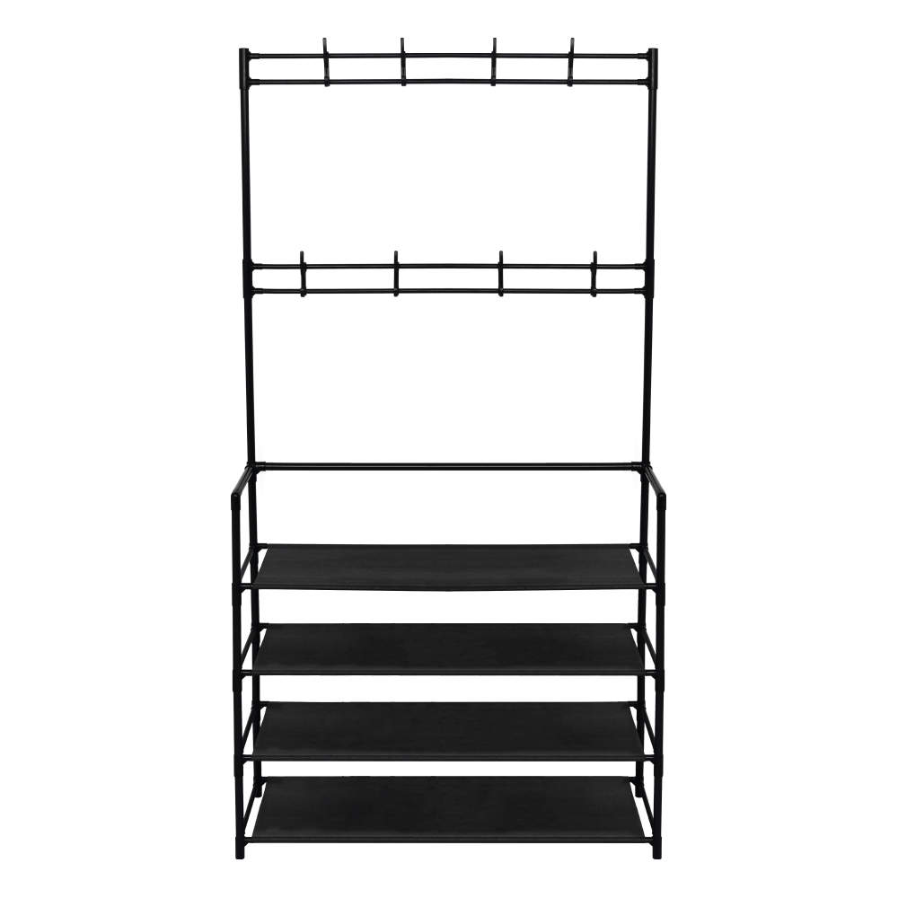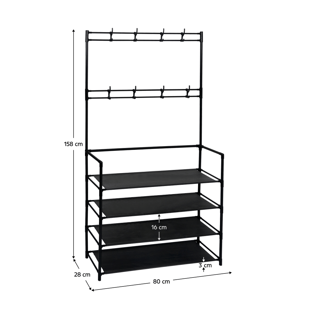 Materiál konstrukce: kov/plast/látka Barva konstrukce: černá Rozměry (ŠxHxV): 80x28x158 cm Osm háků Nosnost háčku: 2 kg Čtyři police Výška mezi policemi: 16 cm Výška od země po spodní část police: 3 cm Nosnost na jednu polici: 4 kg Univerzální design Jednoduchý Praktický Dodáváno v demontu
