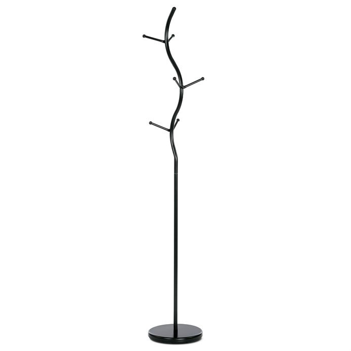 Stojanový věšák s výškou 180 cm je vyroben z pevného kovu s matnou černou povrchovou úpravou, která zajišťuje odolnost proti poškození a snadnou údržbu. Design věšáku je tvořen elegantně prohnutou hlavní tyčí s šesti rozloženými háčky zakončenými kulatými koncovkami, které zabraňují sklouznutí oděvů. Stabilní kulatá základna poskytuje dostatečnou oporu a zaručuje bezpečné postavení i při plném zatížení do 10 kg. Věšák je vhodný pro umístění v předsíních, kancelářích či čekárnách, kde kombinuje funkčnost s minimalistickým moderním vzhledem.