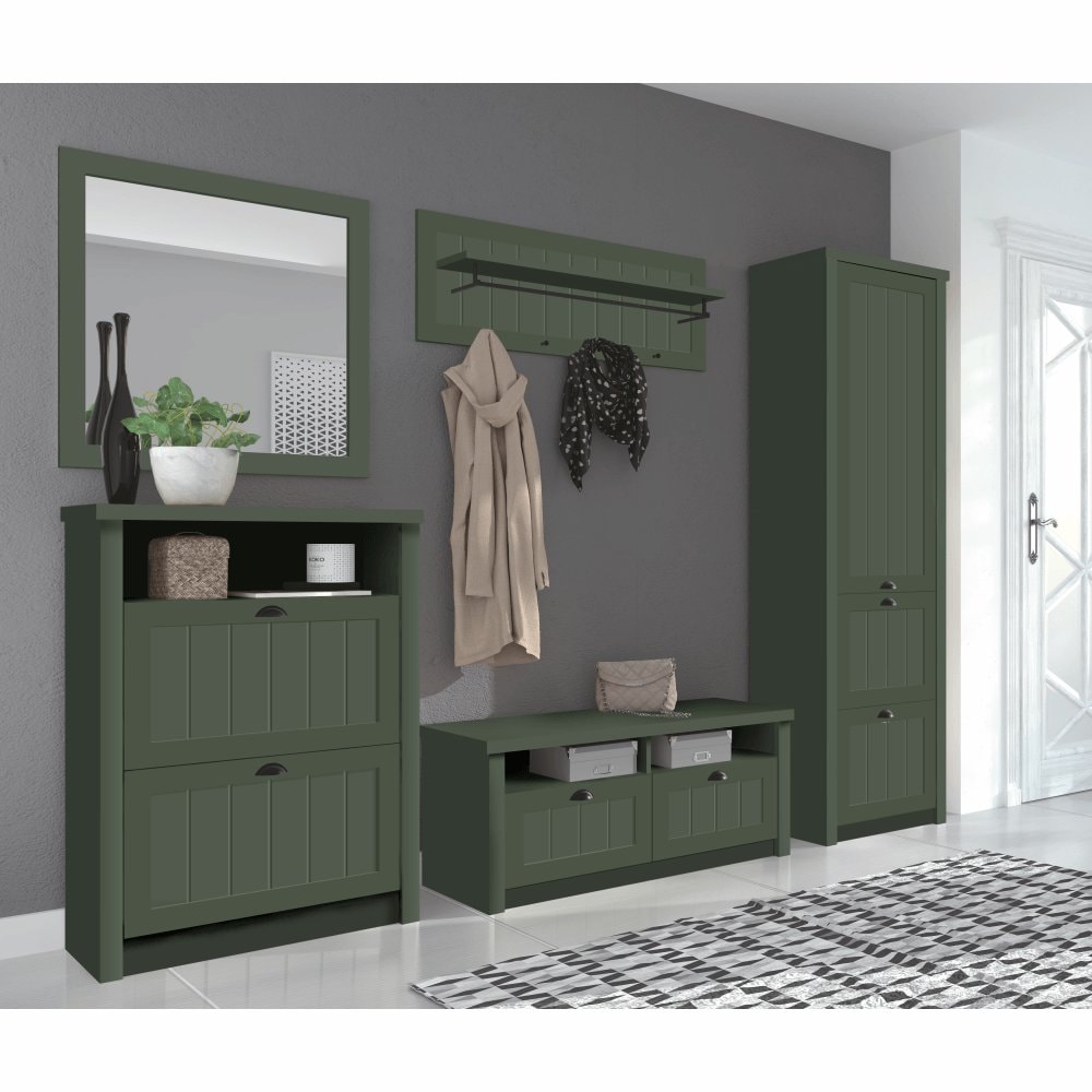 Materiál: DTD laminovaná Barva: zelená Rozměry (ŠxHxV): 109x22x40 cm Tloušťka materiálu korpus: 15 mm Otevřený úložný prostor S policí S věšákovou tyčí S háčky Dodávané v demontu.