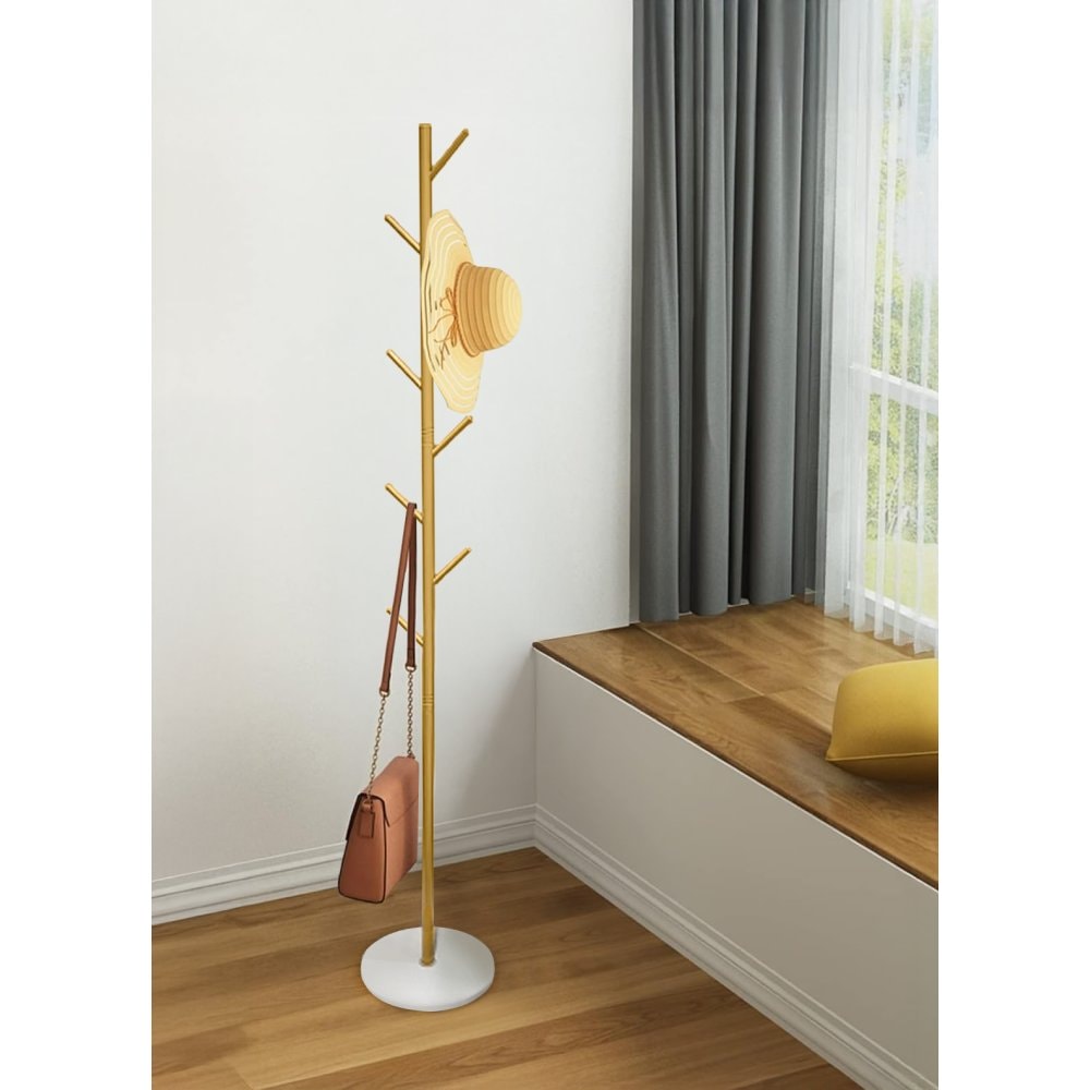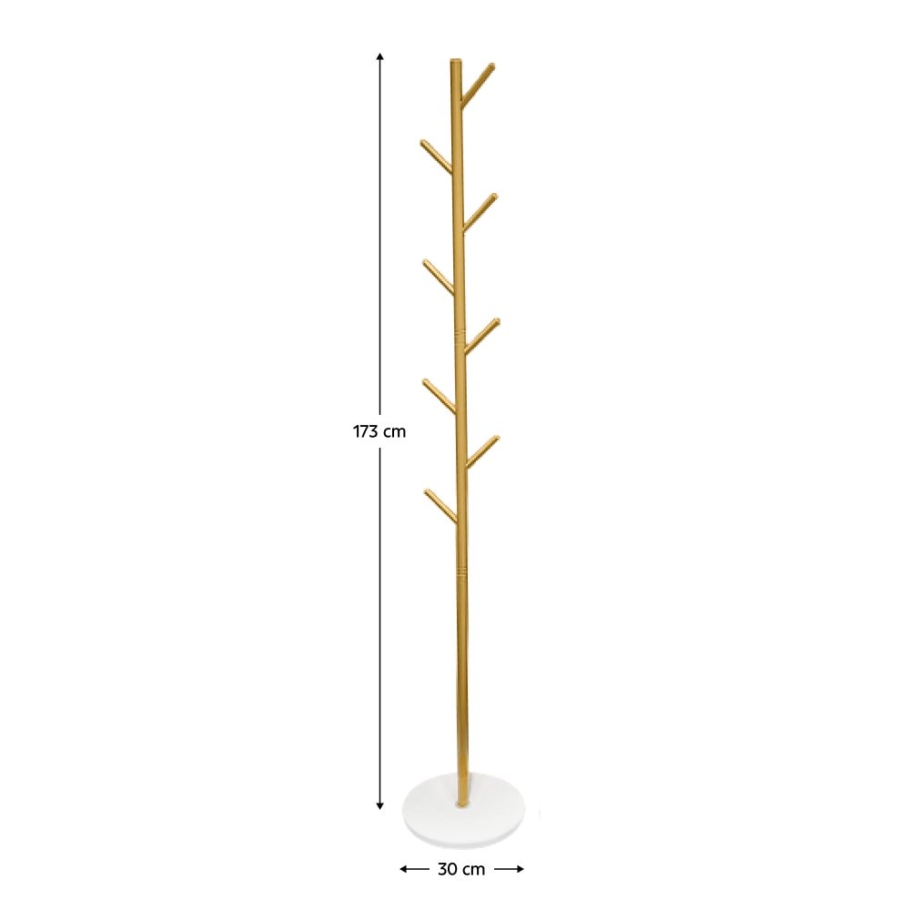 Stojanový věšák TUKAN je stylový a praktický doplněk do vašeho domova. Je vyroben ze zlatého kovu a má pevnou bílou základnu z kamene, díky čemuž je stabilní i při větším množství oblečení. Díky několika ramenům si na něj snadno zavěsíte vše potřebné. Pomůže vám udržet pořádek a přinese do vašeho interiéru moderní vzhled.