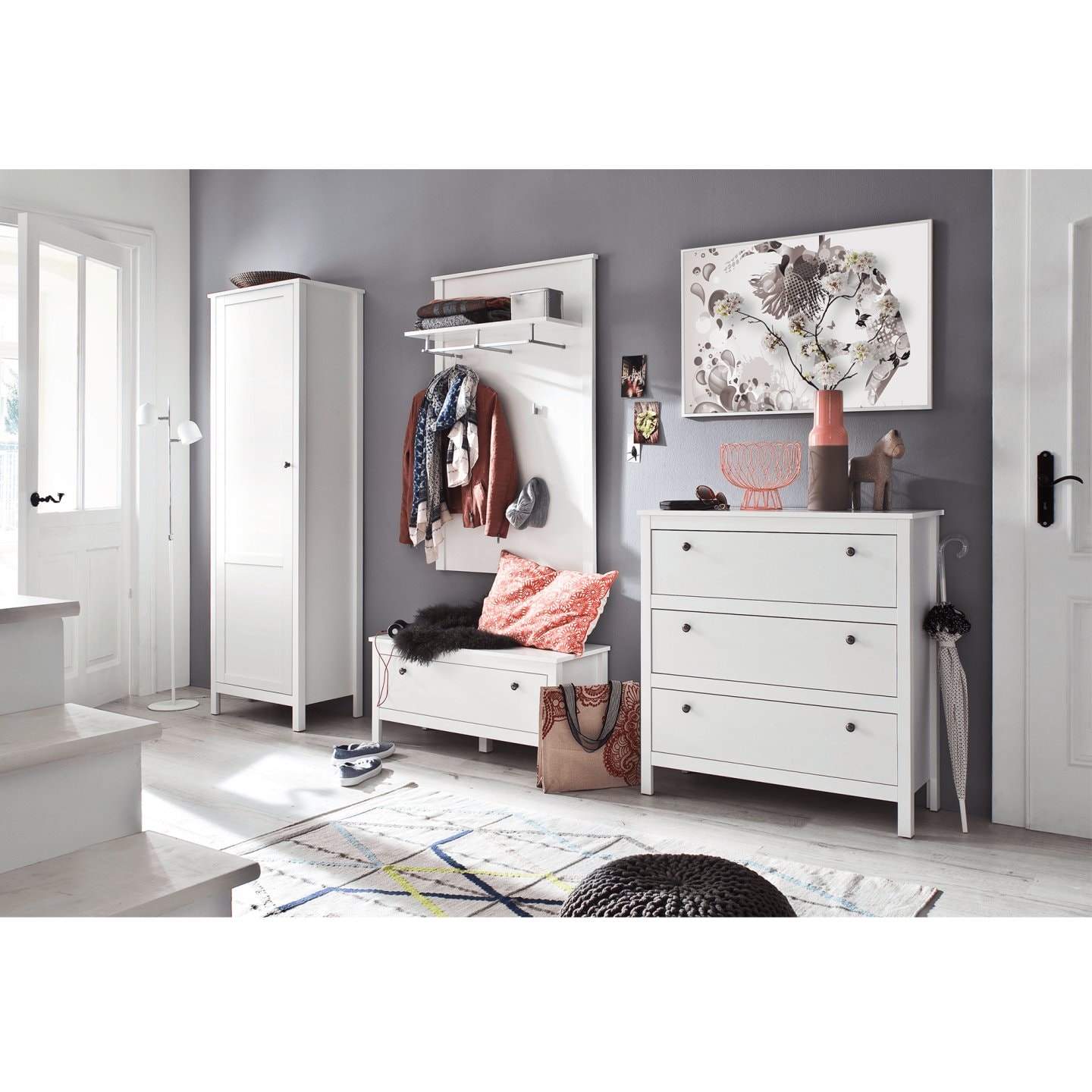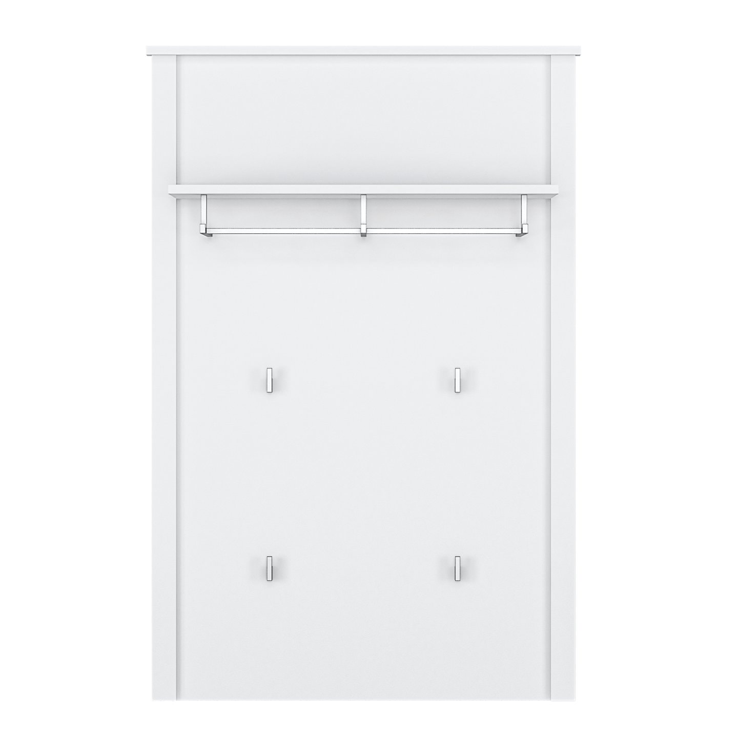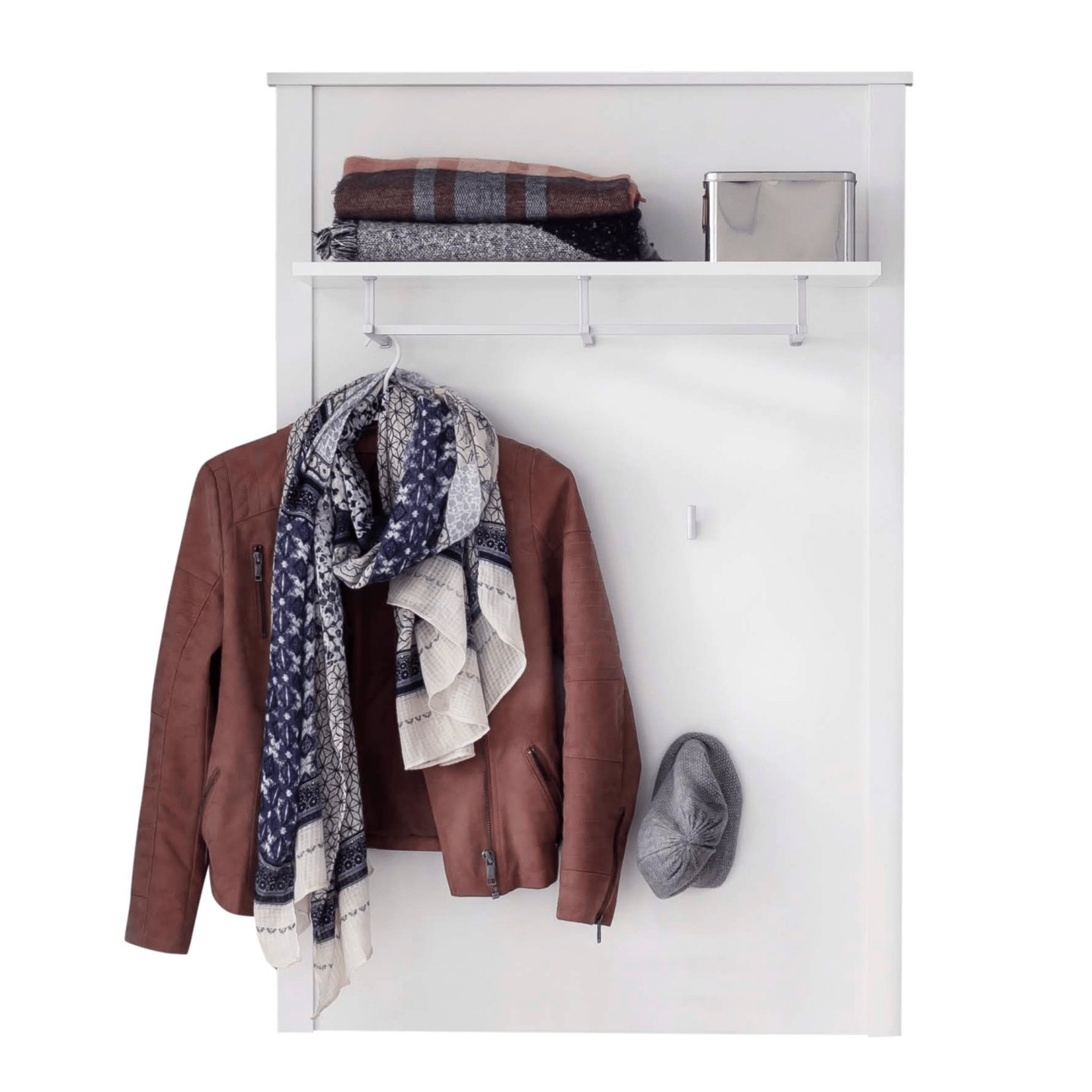 Materiál: DTD laminovaná/ABS hrany/kov Barva: bílá Rozměry (ŠxHxV): 81x26x122 cm Tloušťka materiálu: 1,6 cm Nosnost police: 5 kg Police Věšáková tyč Čtyři věšáky Dodávána v demontu