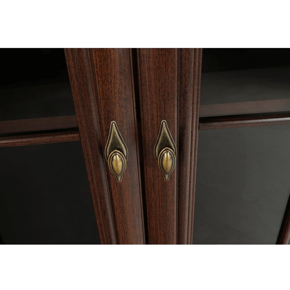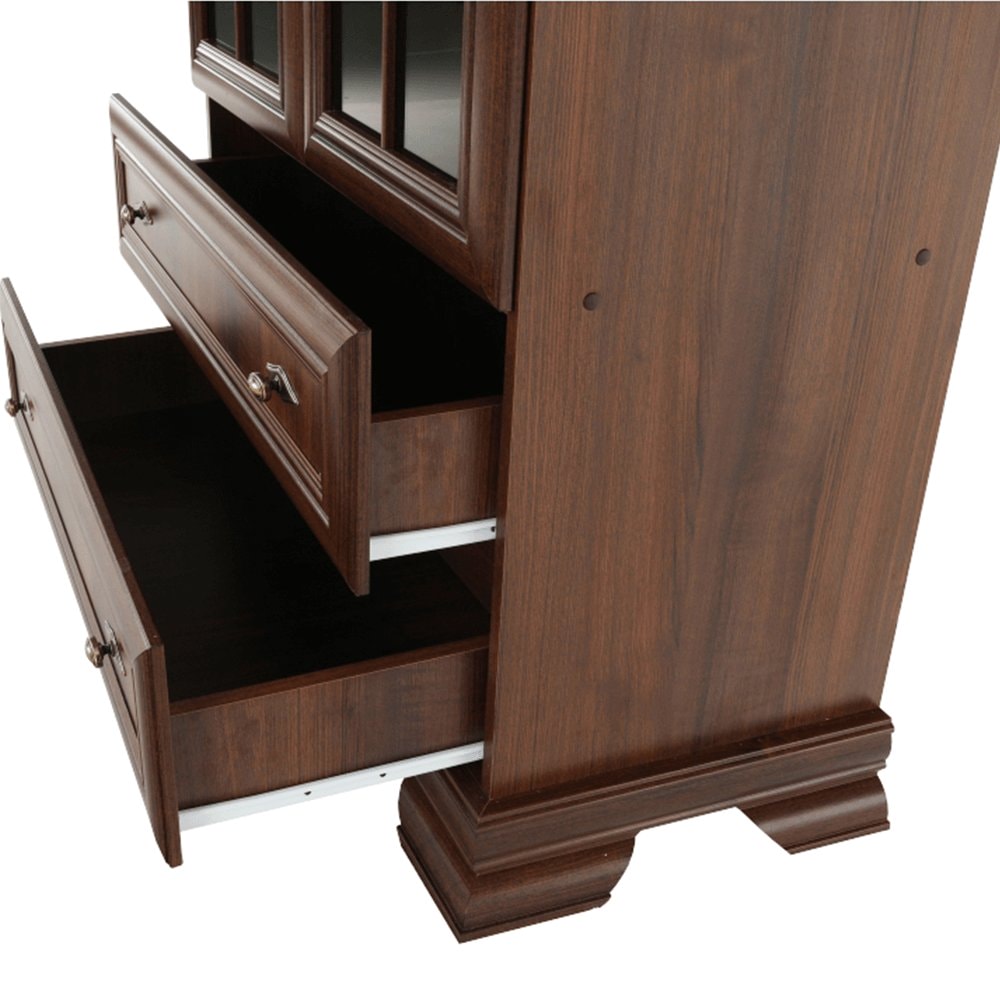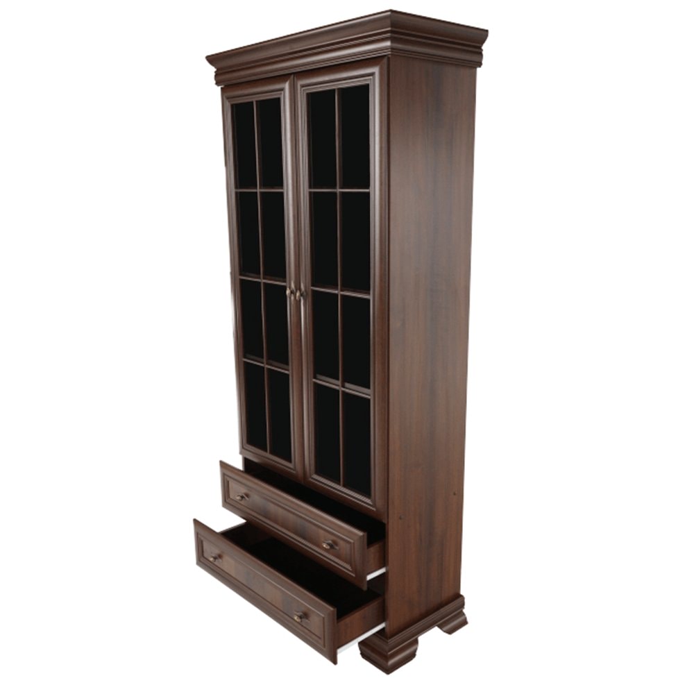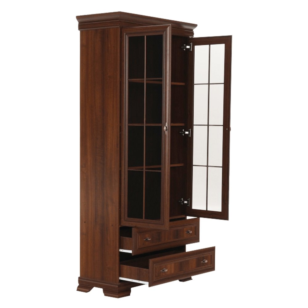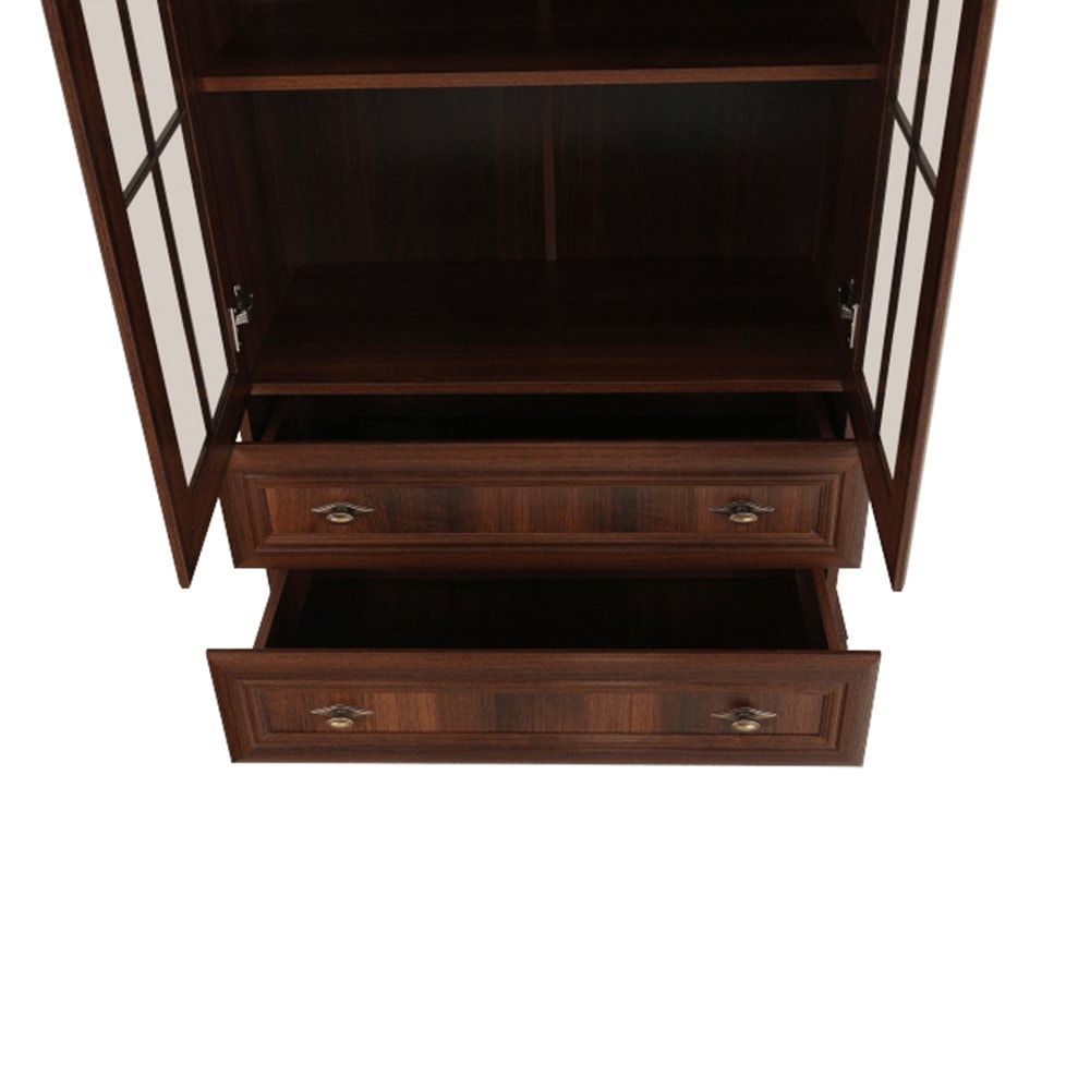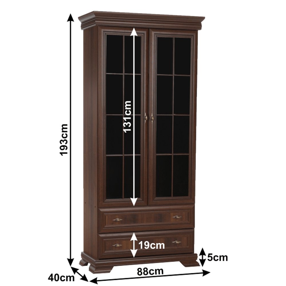 Dvoudveřová vitrína KORA KRW2 je dvěma policemi rozdělena na tři úložné prostory. Ve spodní části jsou dva stejně hluboké šuplíky. Dveře vitrín jsou se sklem.