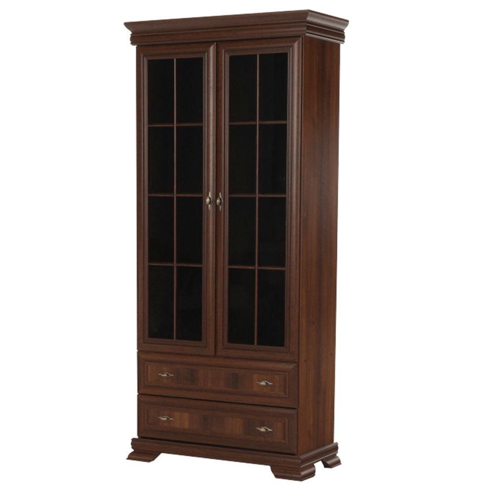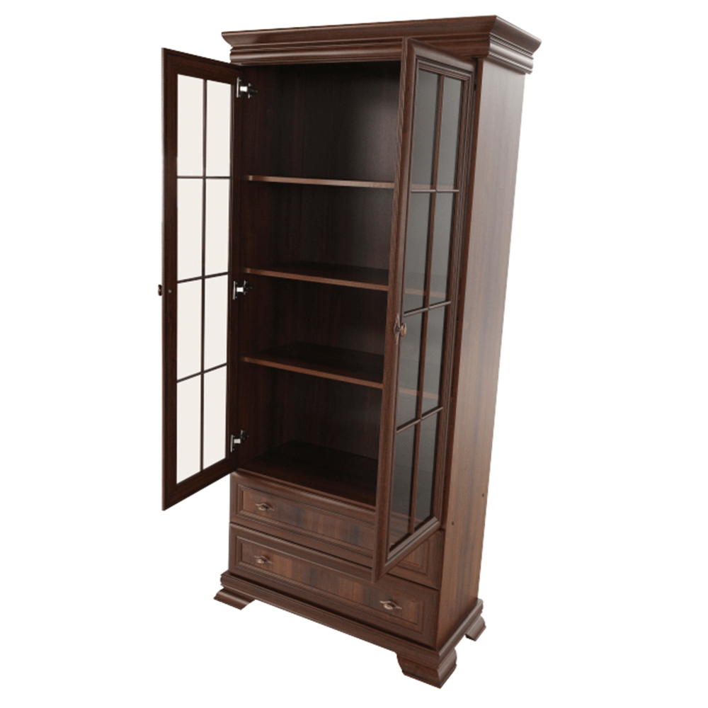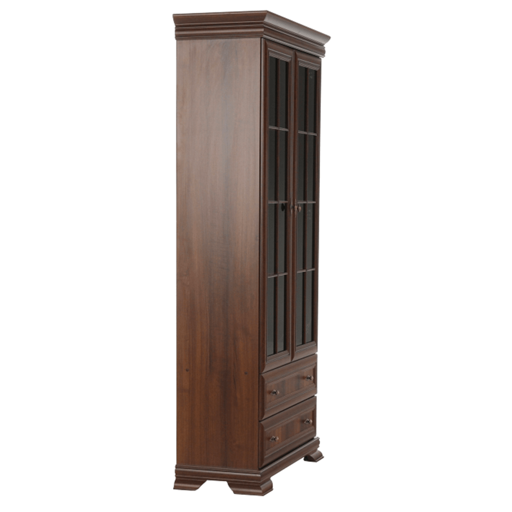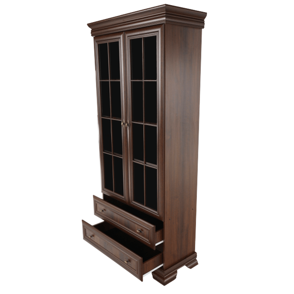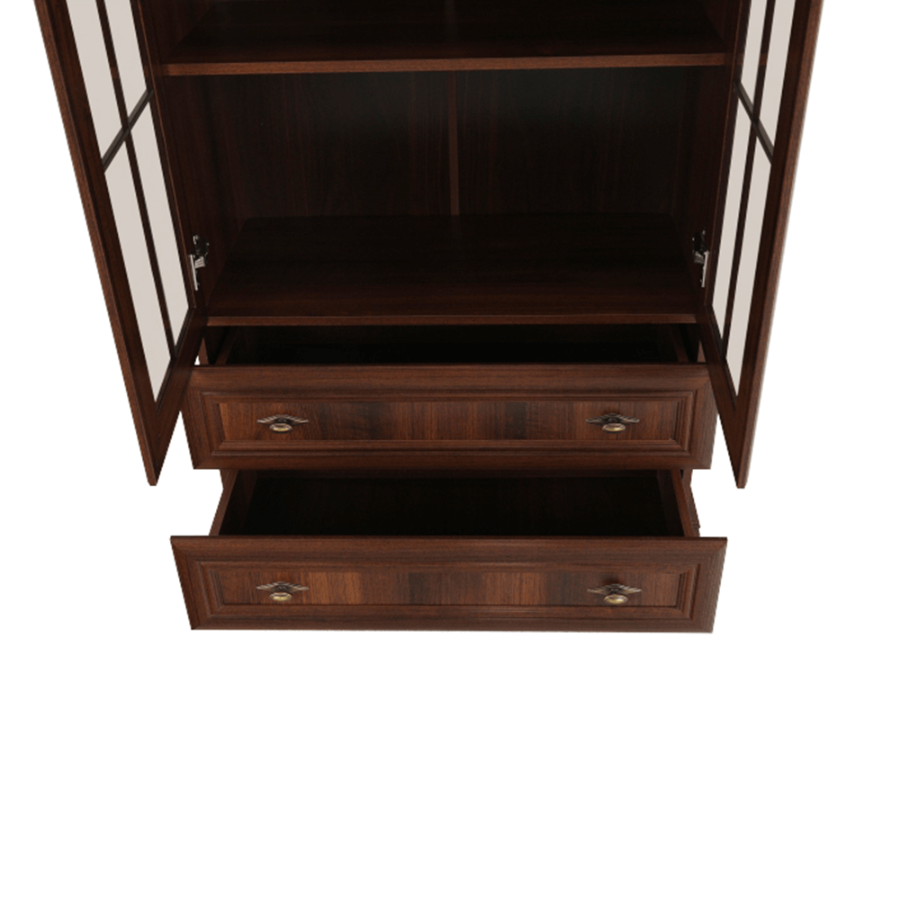 Dvoudveřová vitrína KORA KRW2 je dvěma policemi rozdělena na tři úložné prostory. Ve spodní části jsou dva stejně hluboké šuplíky. Dveře vitrín jsou se sklem.