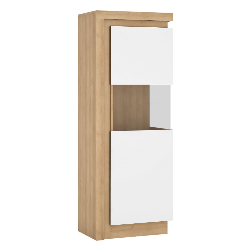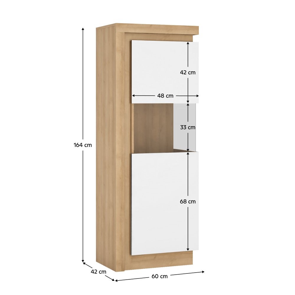 Vitrina LYOV01P ze sektorové sestavy LEONARDO v provedení dub riviera / bílá s extra vysokým leskem Rozměry (ŠxHxV): 60x42x164 cm Tloušťka materálu: 16 mm Systém tichého dorazu dvířek LED osvětlení po obvodu je v ceně Dodávané v demontu