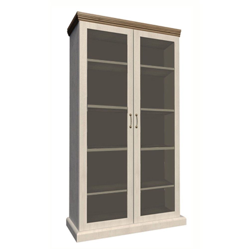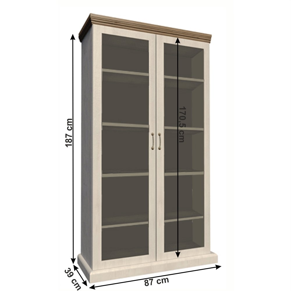 Vitrína WS, dvoudveřová s pěti policemi z elegantního sektorového systému Royal v provensálském stylu. Vhodná na zařízení obývacích pokojů či ložnic. Materiál: korpus DTD laminovaná + ozdobné lišty, kovové úchytky Barevné provedení: sosna skandinávská v kombinaci s dubem divokým. Rozměry ŠxHxV:…