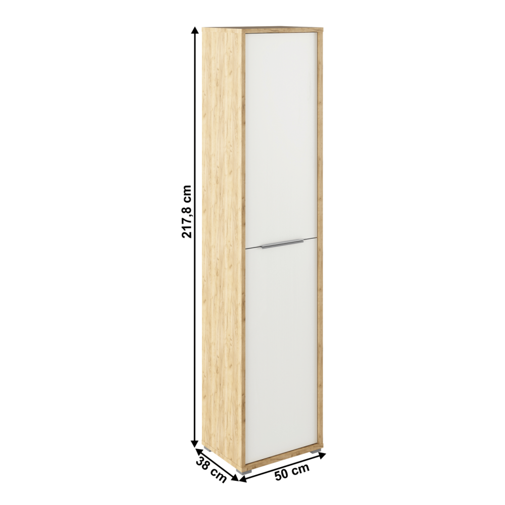 Vysoká policová skříň RIOMA TYP 06 Barevné provedení: dub artisan/bílá Materiál: DTD laminovaná Rozměry (ŠxHxV): 50x38x217,8 cm Tloušťka materiálu: 16/22 mm Dodávané v demontu