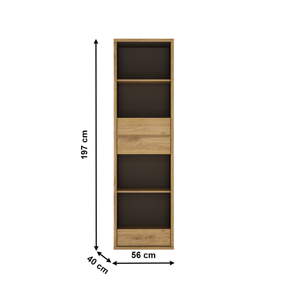 Materiál: laminovaná DTD Barevné provedení: dub Shetland/šedá Rozměry (ŠxHxV): 56x40x197 cm Tloušťka korpusu: 2,8 cm bez úchytová Jednoduchý a elegantní hrubý korpus 3 šuplíky 2 poličky 4 otevřené části moderní styl vysoká kvalita precizní zpracování Odolný vůči poškrábání, UV záření, vysokým teplotám Nosnost poličky: 5 kg Nosnost šuplíku: 5 kg Dodávané v demontu