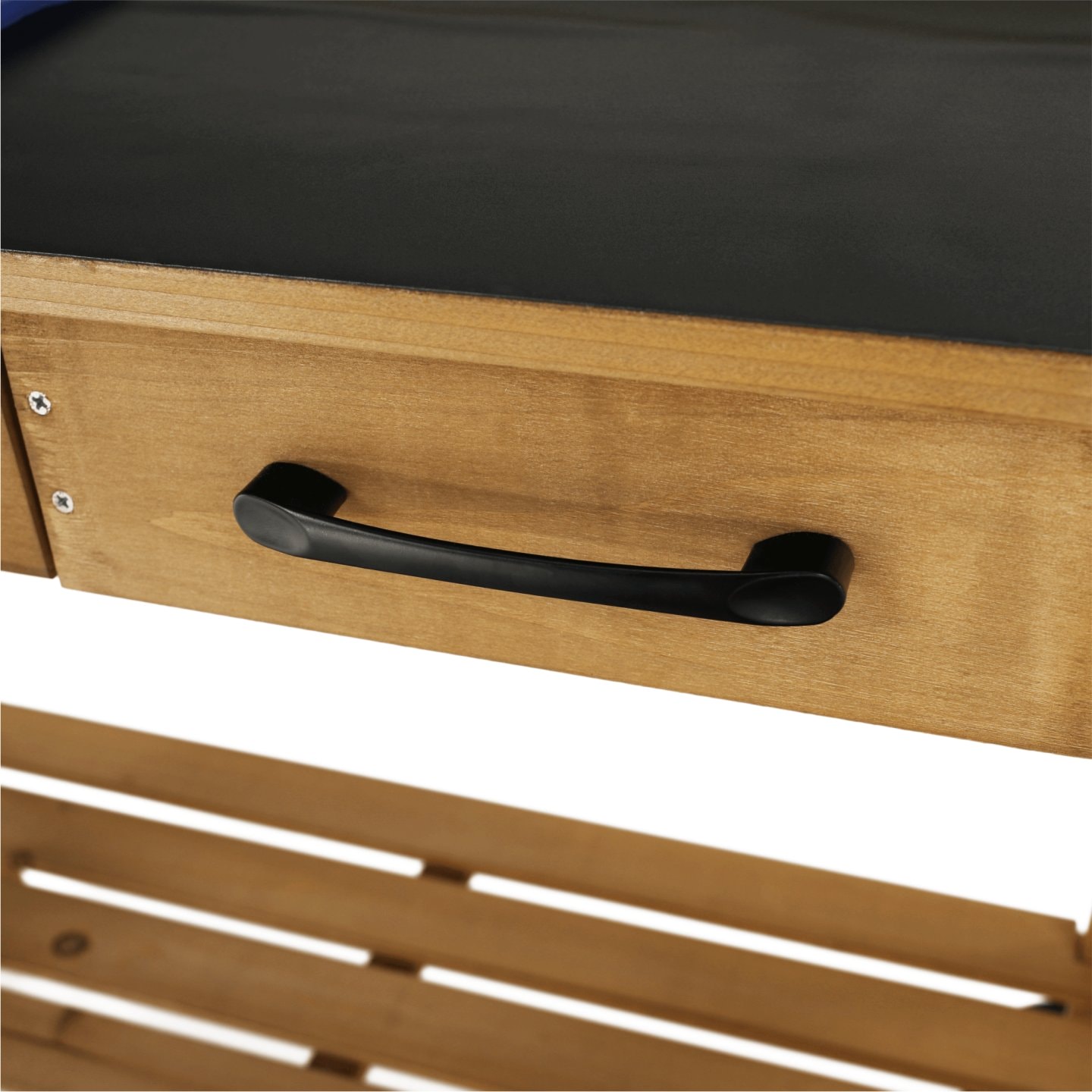 Materiál konstrukce: dřevo Materiál povrch stolu: polypropylen Barva: hnědá/černá Rozměry (ŠxHxV): 94x49x120 cm Nosnost: 15 kg Pracovní plocha S policí S praktickým šuplíkem Obsahuje tři háčky na zavěšení Na dvou kolečkách Dodávané v demontu