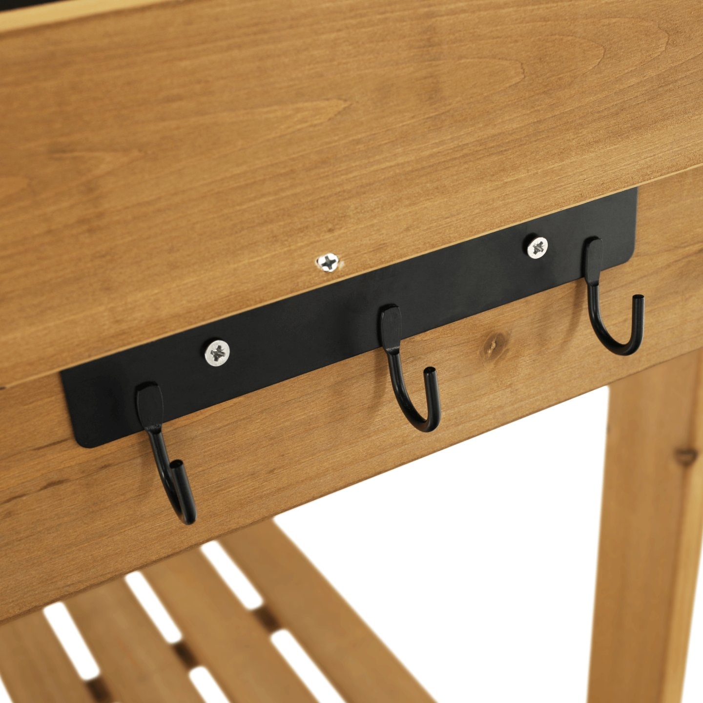 Stůl je vyroben ze dřeva v hnědém barevném provedení. Nabídne vám množství odkládacího a úložného prostoru. Obsahuje odnímatelnou nádobu, která poslouží jako náhrada za umyvadlo, velkou polici na odkládání, zásuvku v podobě šikovného šuplíku a tři praktické háčky na zavěšení utěrky. Stolek obsahuje 2 kolečka, které slouží k usnadnění manipulace a přesunu. BARDY je ten pravý pomocník na zahradu.