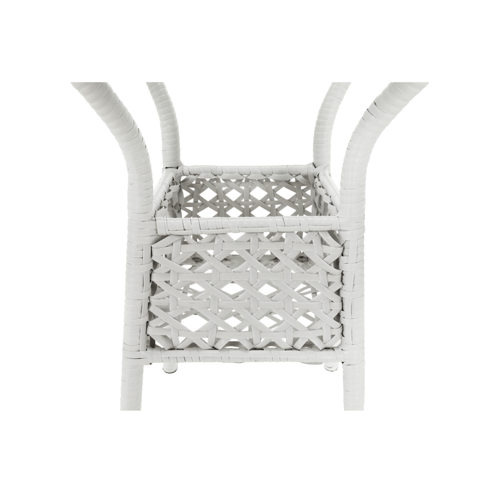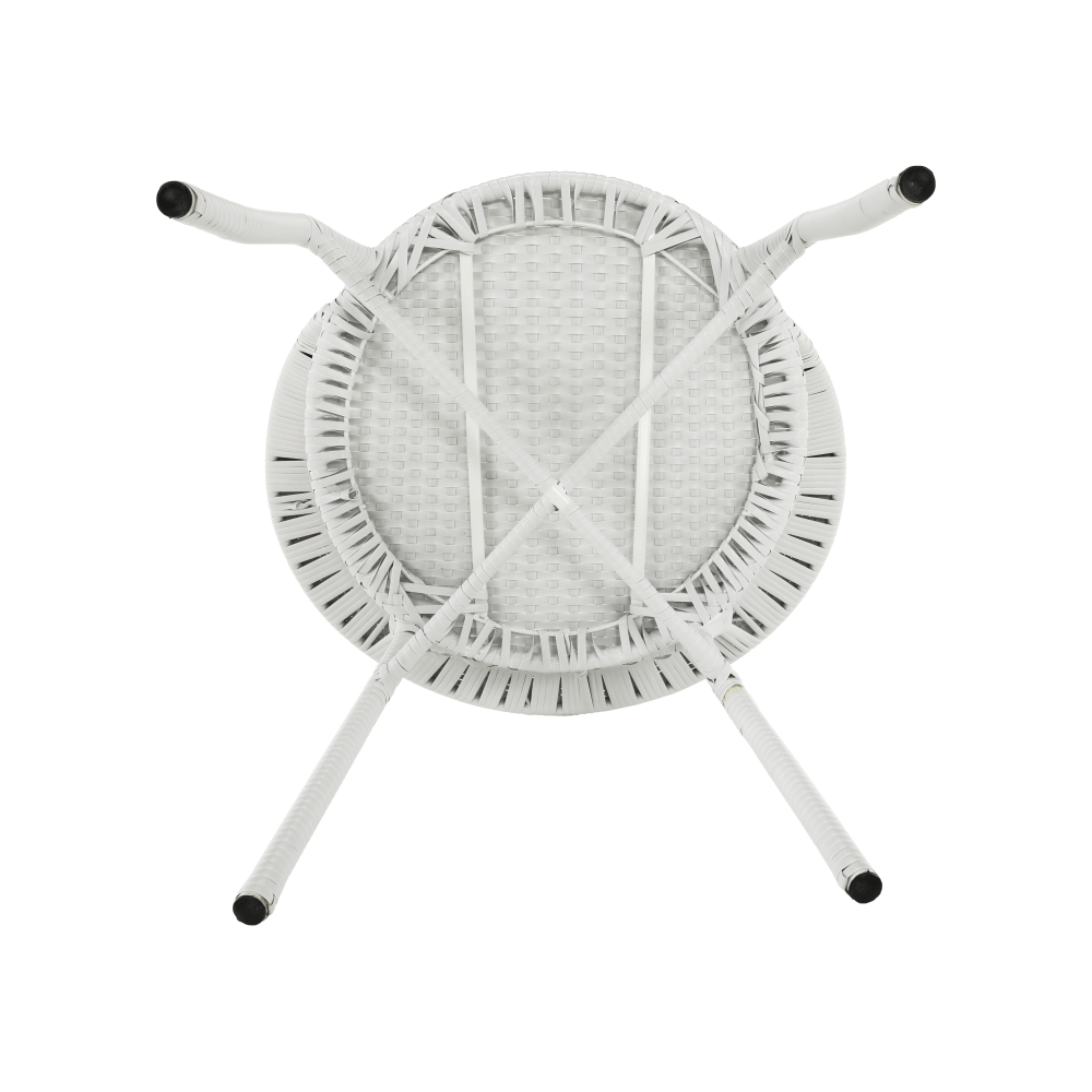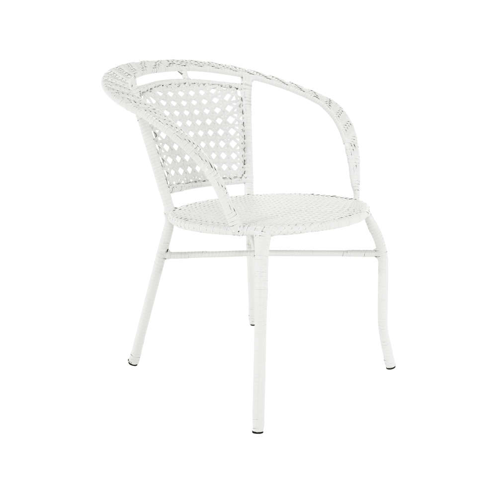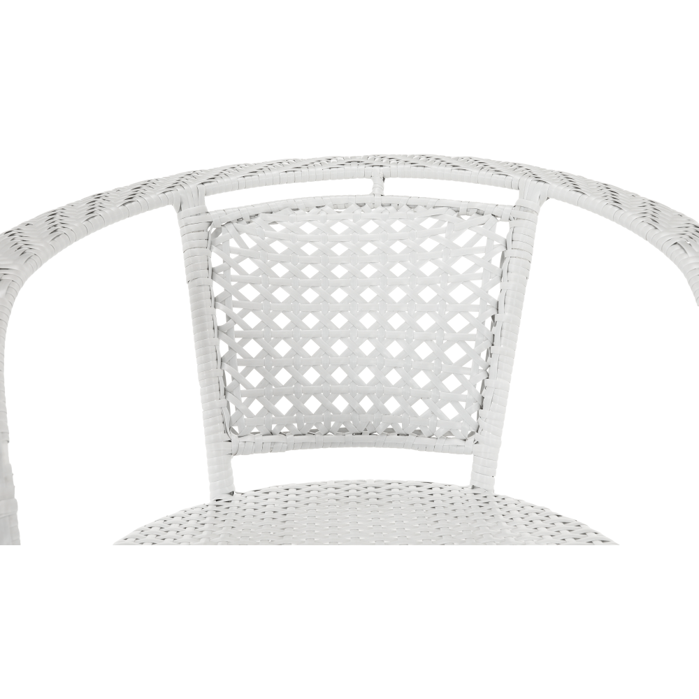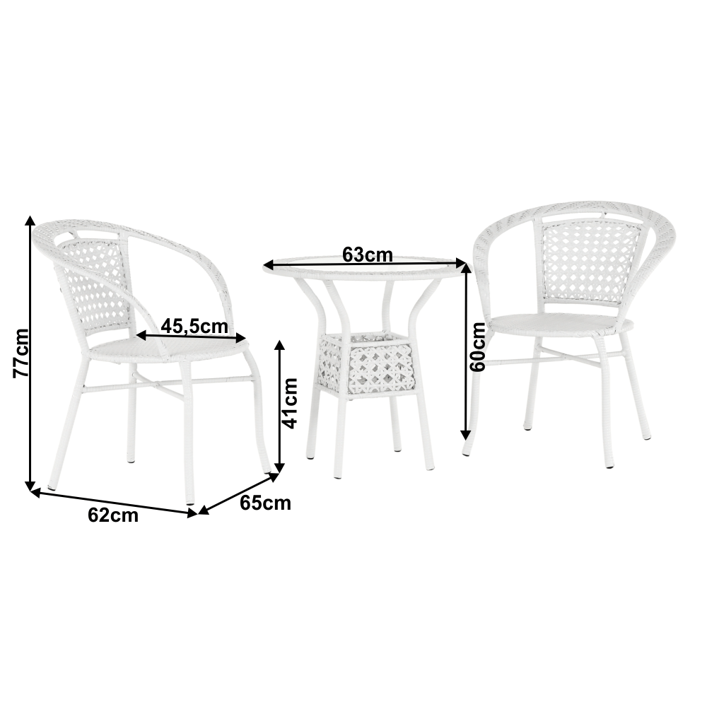 Materiál: umělý ratan / ocel / tvrzené sklo Barva: bílá Stůl (průměr x V): 63x60 cm Křeslo (ŠxHxV): 65x62x77 cm Hloubka sedu křesla: 45,5 cm Výška sedu křesla: 41 cm Nosnost křesla: 100 kg 3-dílná souprava Jeden kulatý stůl Dvě křesla Židle / křesla jsou stohovatelné Dodávané v monte