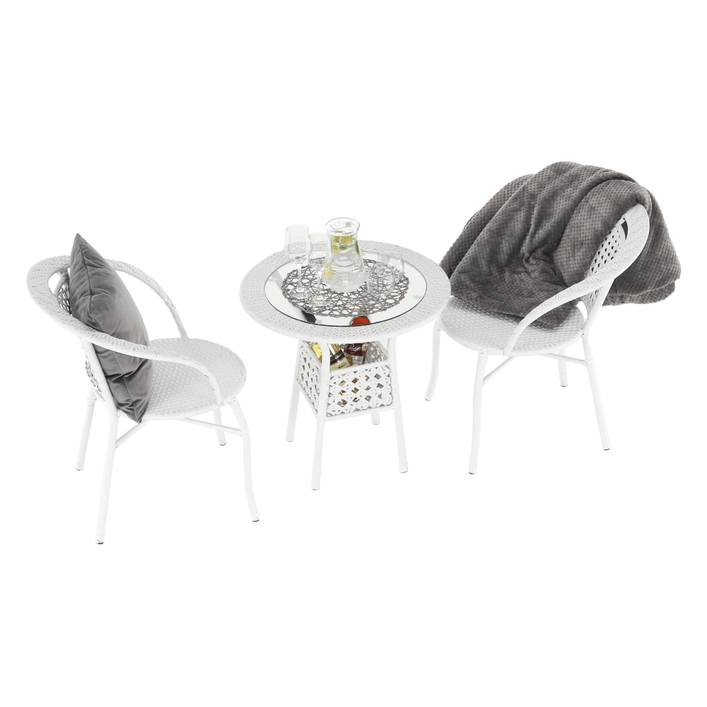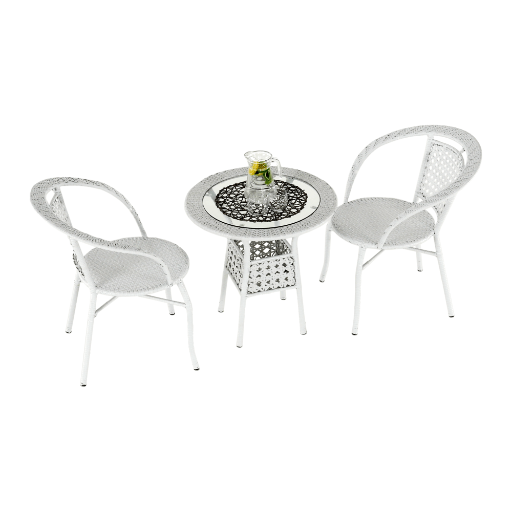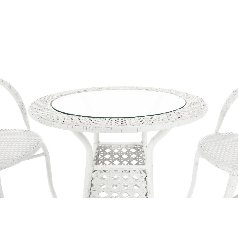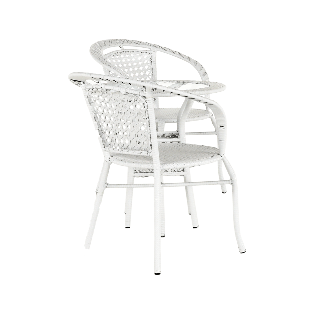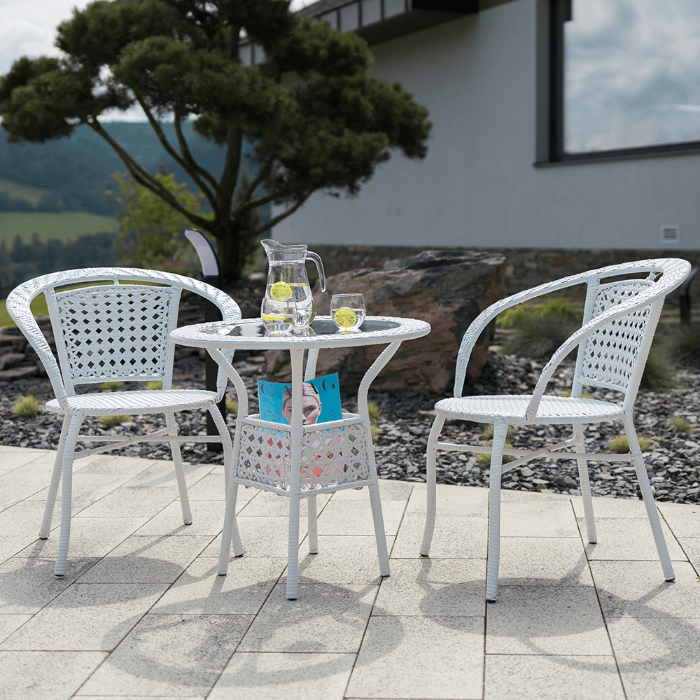 Set je vyroben z kvalitního a pevného umělého ratanu v bílé barvě. Ratan se snadno ošetřuje, jistě oceníte nenáročnou údržbu, za což se vám set odvděčí dlouhou životností. Set sestává ze dvou křesel a kulatého stolu s vrchní deskou z tvrzeného skla. Židle/křesla jsou stohovatelná, stačí je jednoduše pokládat na sebe, když je potřebujete někam přenést nebo zazimovat.