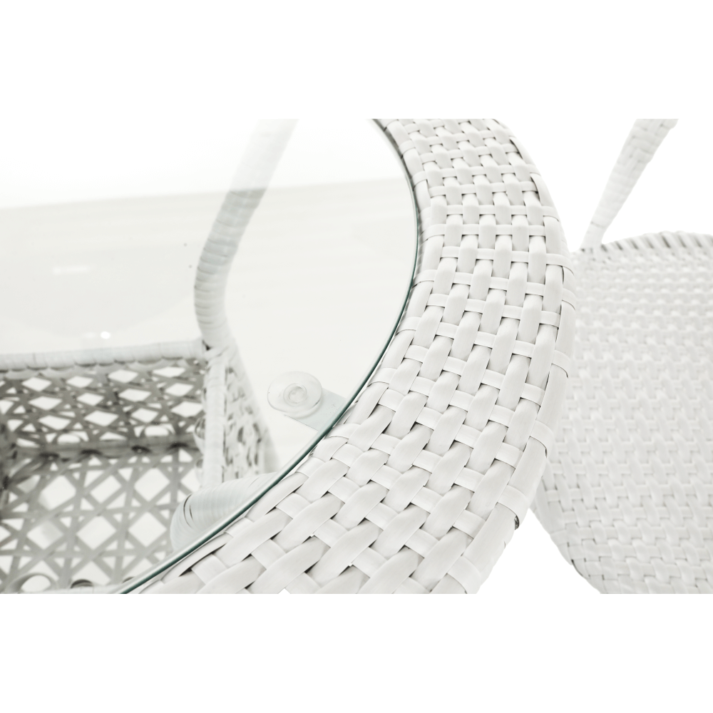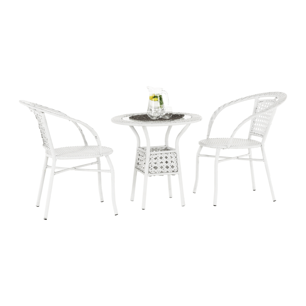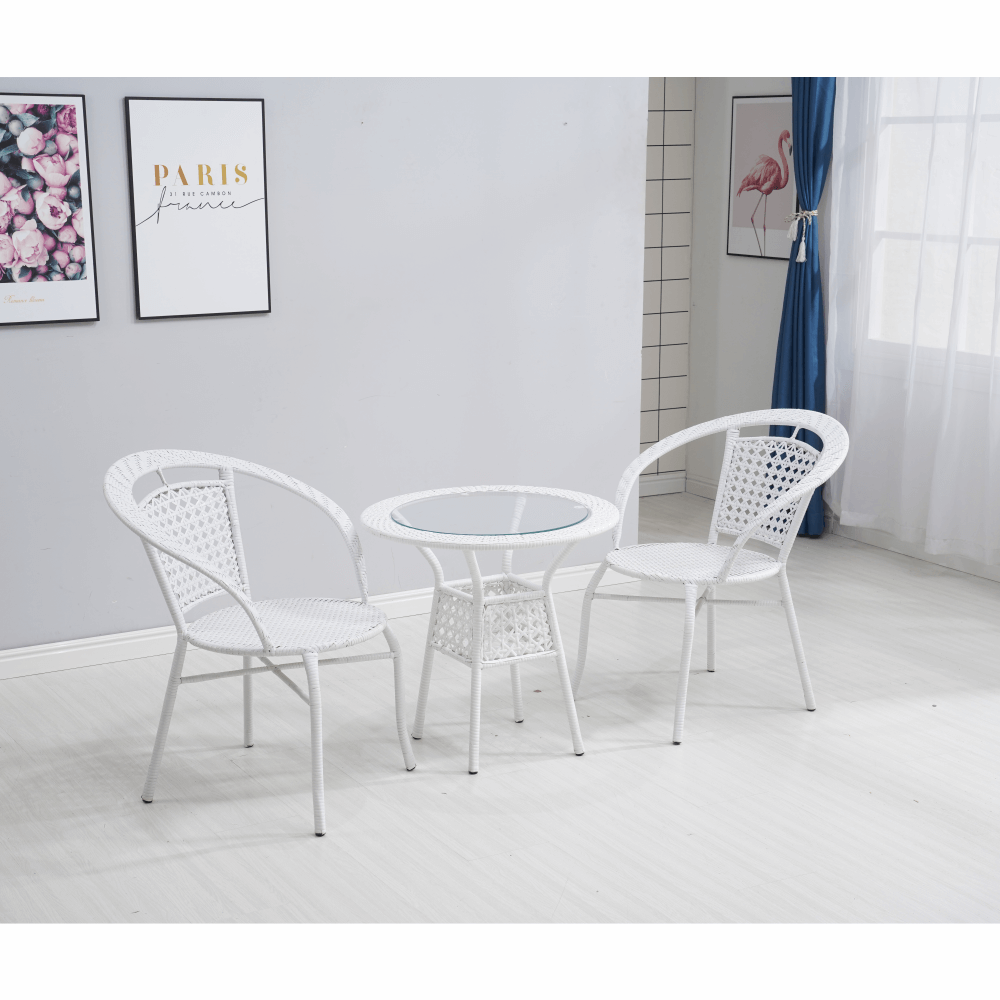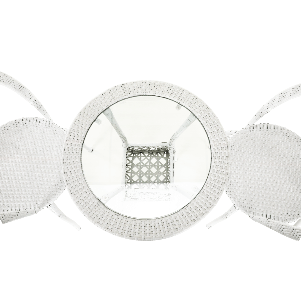 Set je vyroben z kvalitního a pevného umělého ratanu v bílé barvě. Ratan se snadno ošetřuje, jistě oceníte nenáročnou údržbu, za což se vám set odvděčí dlouhou životností. Set sestává ze dvou křesel a kulatého stolu s vrchní deskou z tvrzeného skla. Židle/křesla jsou stohovatelná, stačí je jednoduše pokládat na sebe, když je potřebujete někam přenést nebo zazimovat.