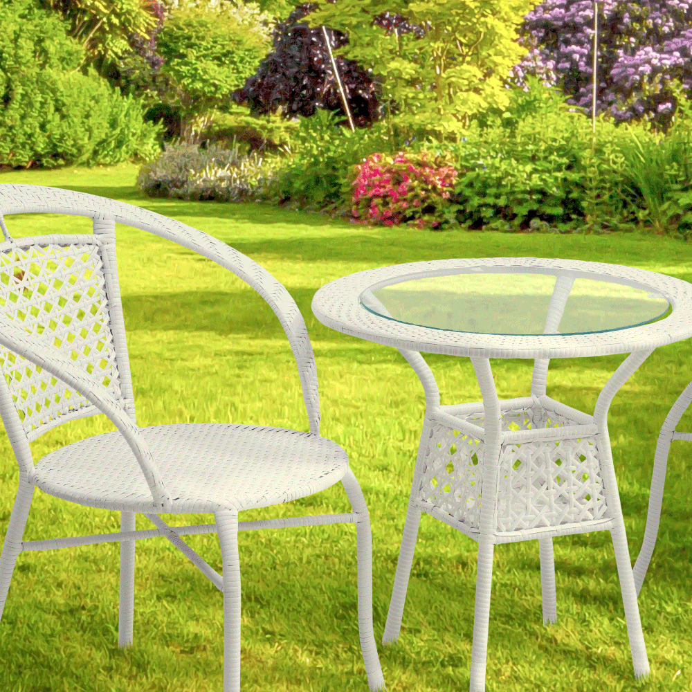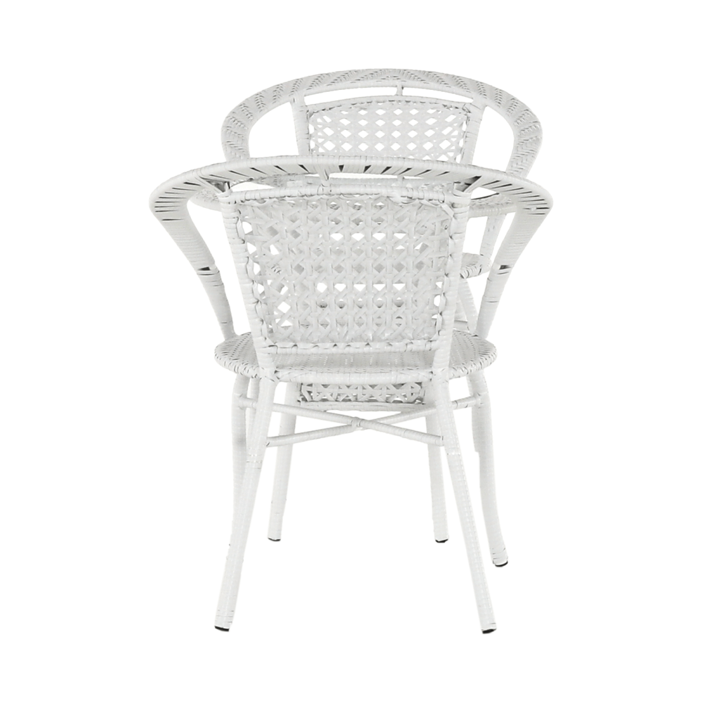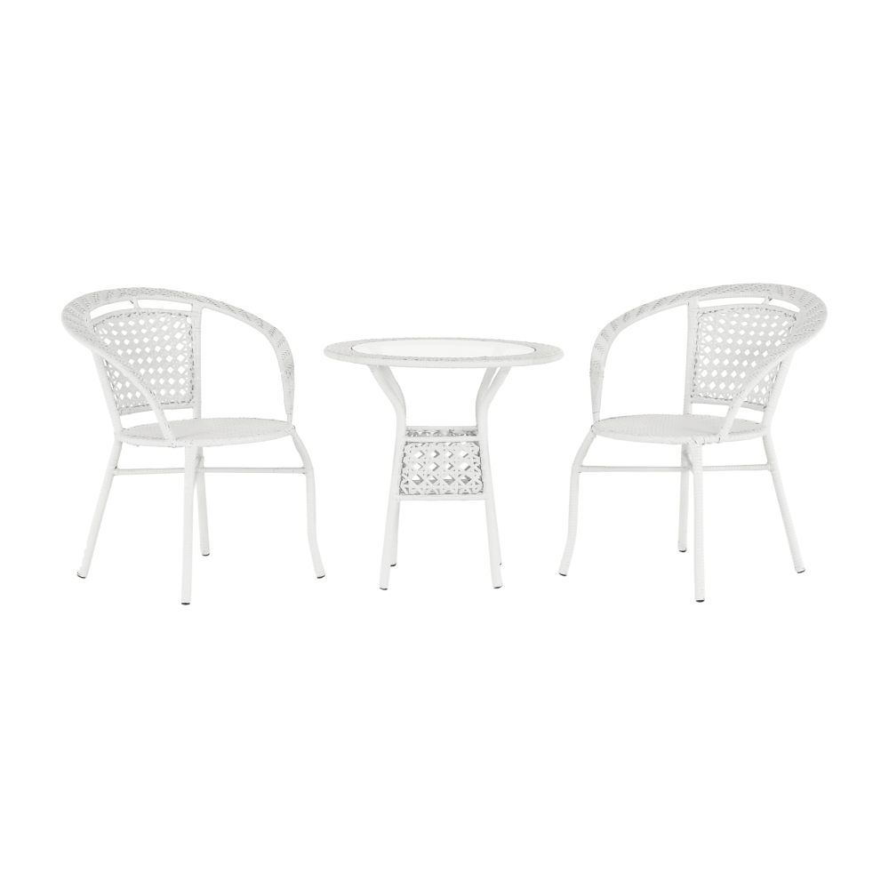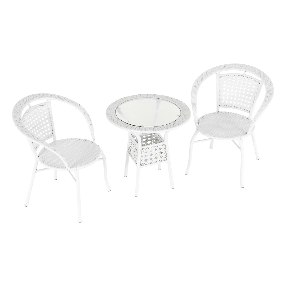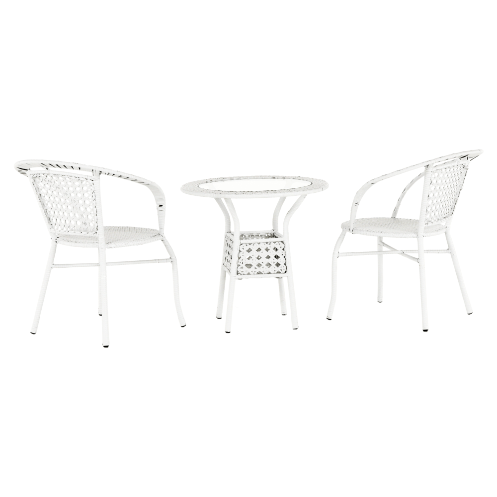 Set je vyroben z kvalitního a pevného umělého ratanu v bílé barvě. Ratan se snadno ošetřuje, jistě oceníte nenáročnou údržbu, za což se vám set odvděčí dlouhou životností. Set sestává ze dvou křesel a kulatého stolu s vrchní deskou z tvrzeného skla. Židle/křesla jsou stohovatelná, stačí je jednoduše pokládat na sebe, když je potřebujete někam přenést nebo zazimovat.