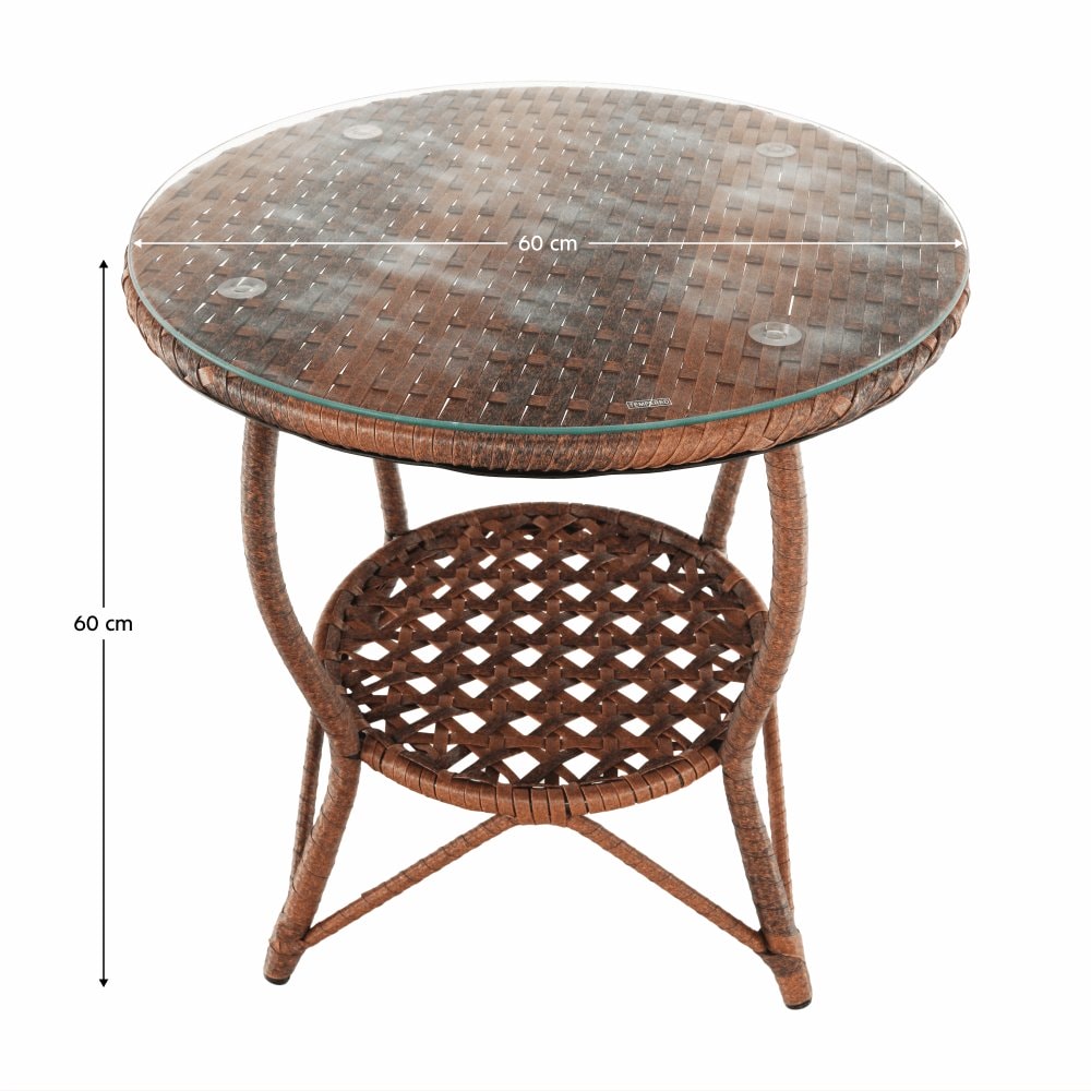 Materiál: umělý ratan / ocel / tvrzené sklo Barva: hnědá Stůl (priemerxV): 60x60 cm Židle (ŠxHxV): 58x59x74 cm Hloubka sedu židle: 45,5 cm Výška sedu židle: 41 cm Nosnost židle: 90 kg 3-dílná souprava jeden stůl dvě židle Židle / křesla jsou stohovatelné Dodávané v monte