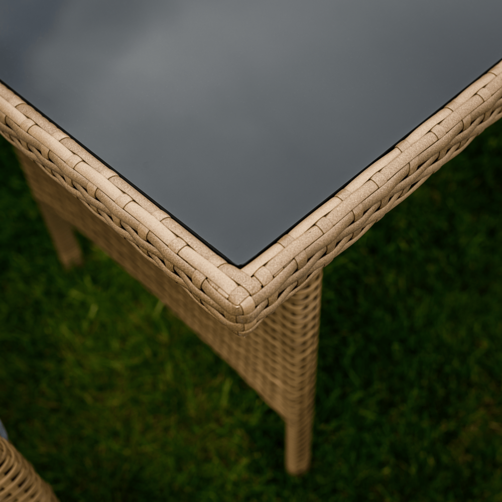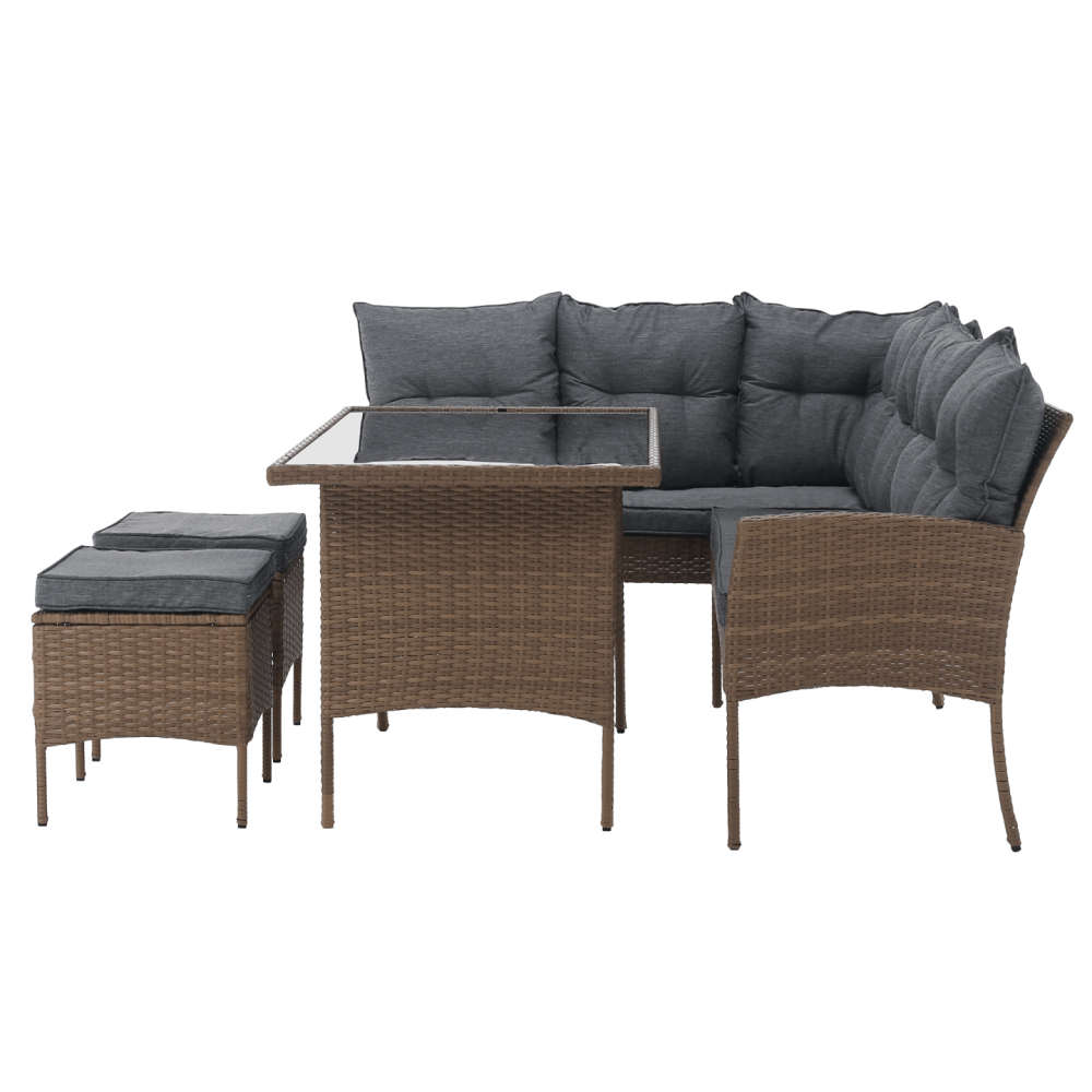Set má k dispozici roh , dva taburety a jídelní stůl s tvrzeným sklem. Na výrobu byl použit technoratan v přírodním barevném provedení. Kovová konstrukce zajišťuje vysokou pevnost a stabilitu. Součástí setu jsou světle šedé polštáře, které jsou vyrobeny z voděodolné látky. Se zahradním ratanovým setem RANDI bude každý den jedinečný a neopakovatelný.