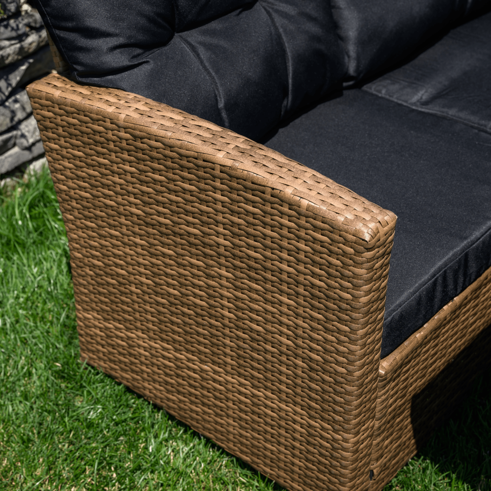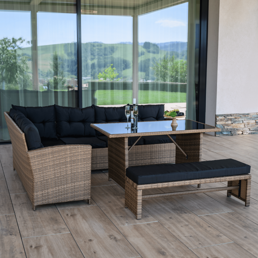3-dílný ratanový set MADUL vám bude neustále k dispozici. Set tvoří roh , lavice a jídelní stůl s tvrzeným sklem, který vám poslouží k servírování jakýchkoli dobrot. Vyroben je z technoratanu ve světle hnědém barevném provedení. Stabilita je zajištěna pomocí pevné kovové konstrukce. O vaše pohodlí při sezení nebo opření zad se postarají látkové polštáře v černé barvě. Potahy na polštářích jsou voděodolné. MADUL je vysněný zahradní ratanový set, bez kterého si svoji zahradu nebo terasu nebudete chtít představit.