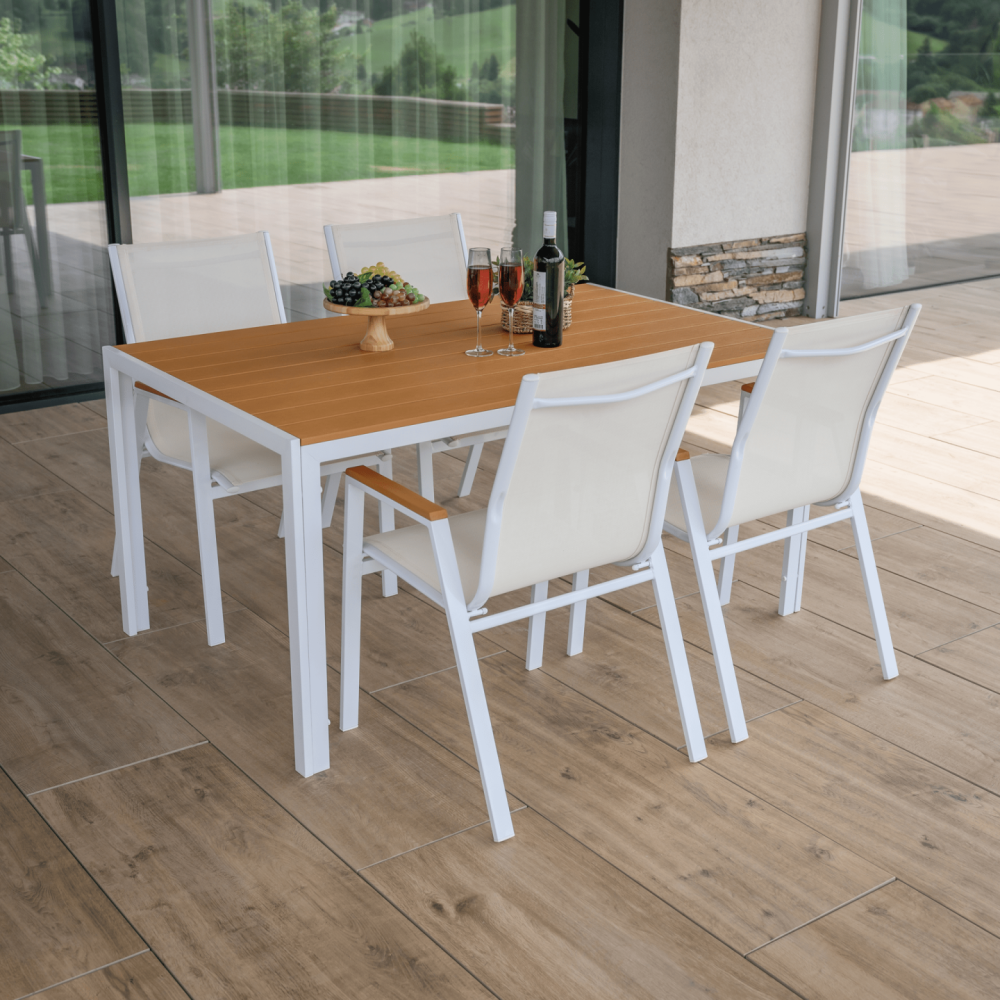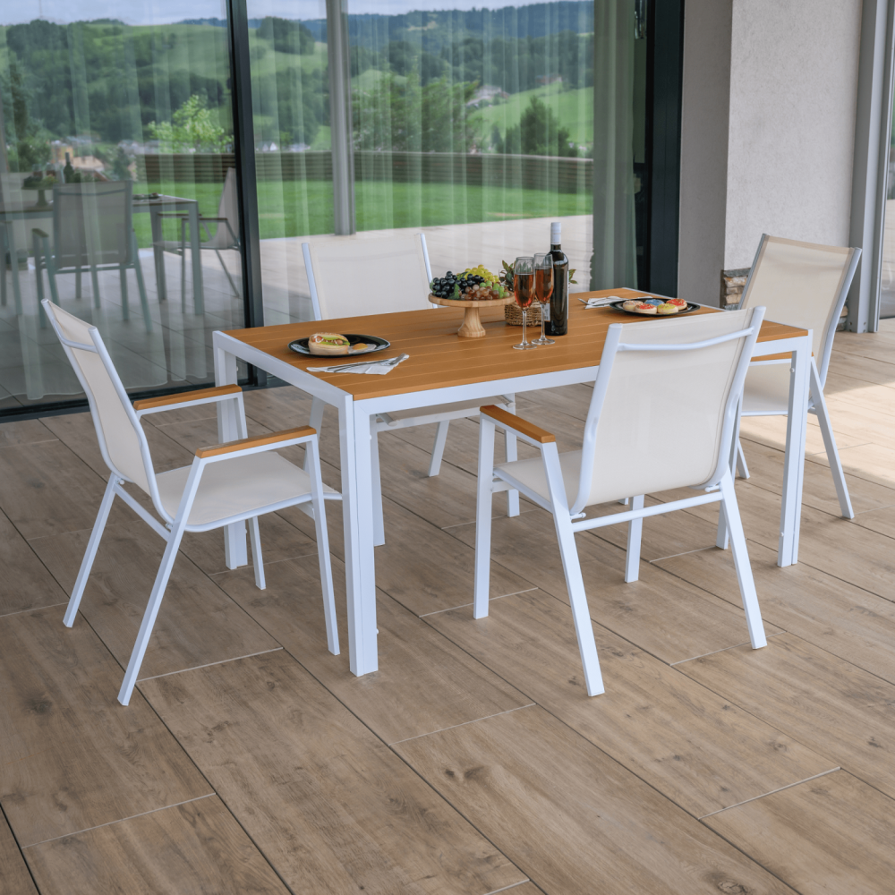 Je vyrobena z umělé látky v bílém barevném provedení. Stabilitu zajišťuje pevná a stabilní konstrukce z bílé oceli. Opěrky na ruku jsou v provedení dub, vyrobeny z materiálu polywood. Židle BONTO se hodí téměř kdekoli, nejen do zahrady. Určitě ji uvítáte i na terase či balkoně.
