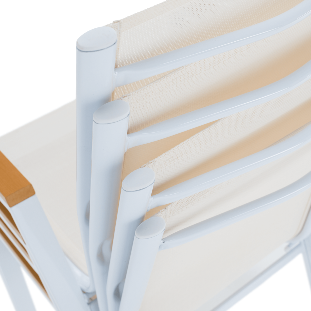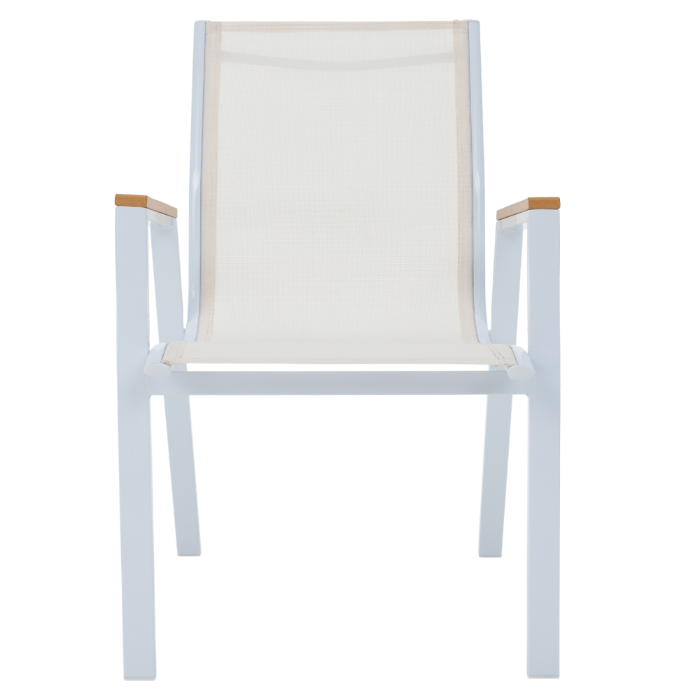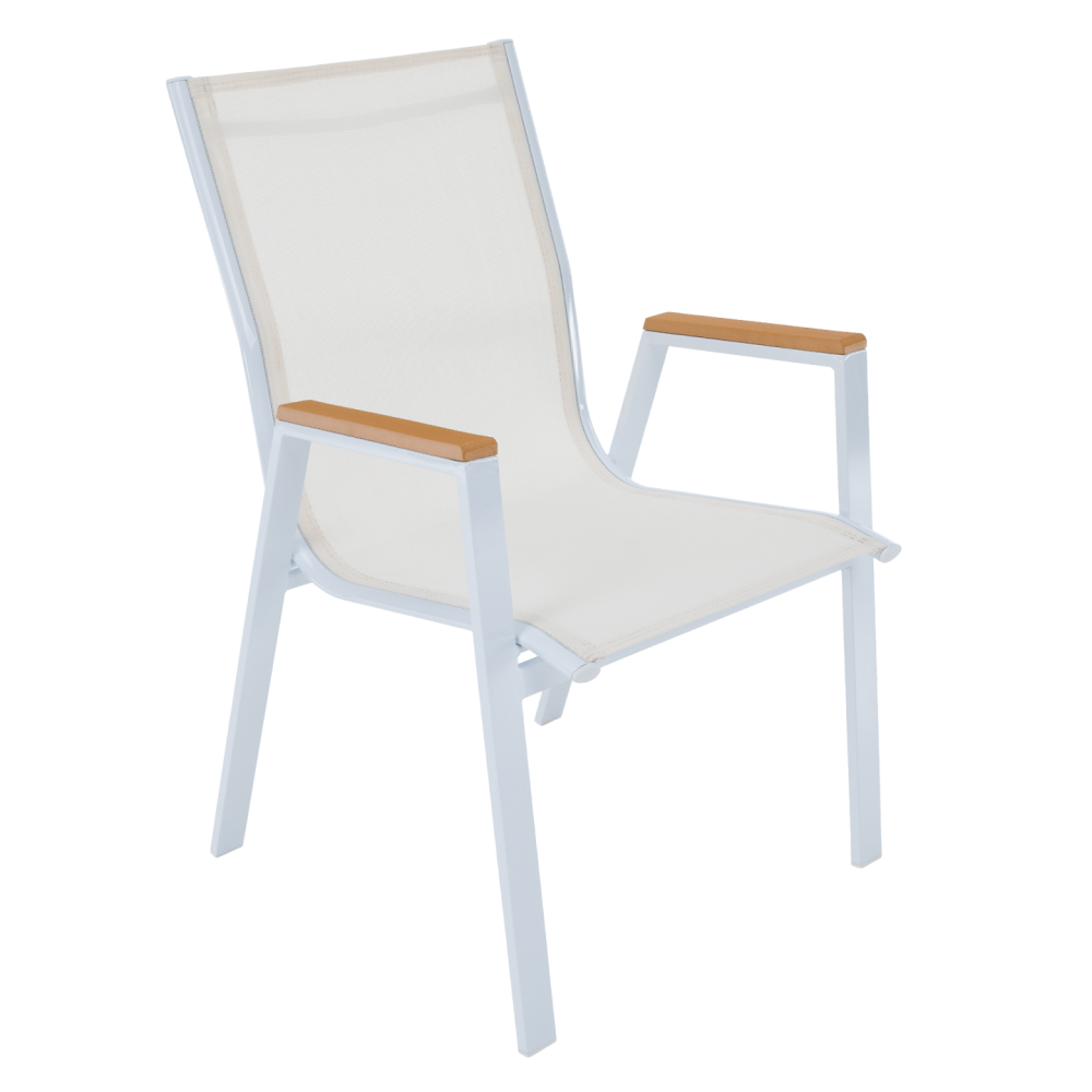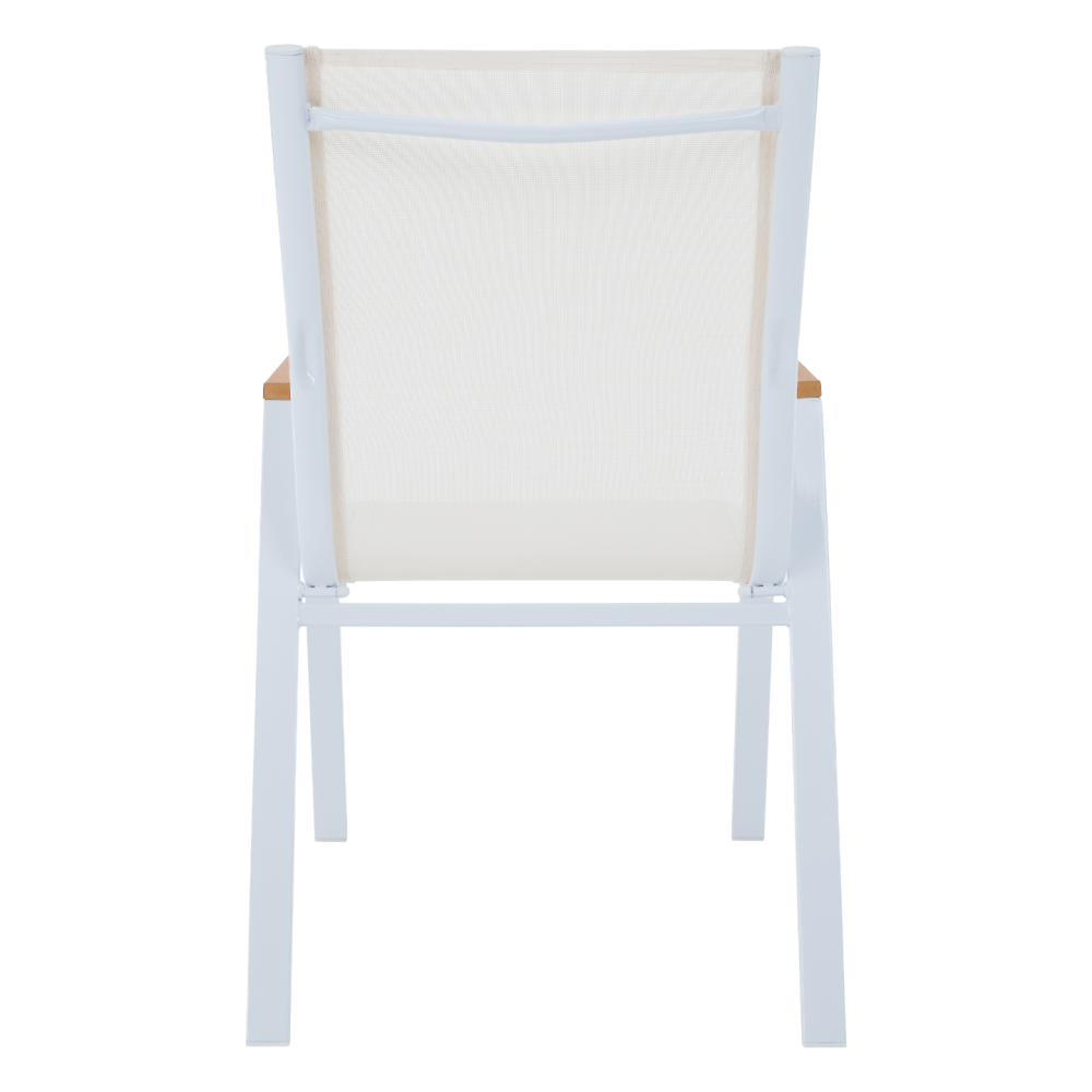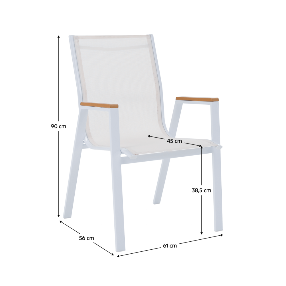 Materiál: ocel/umělá textilie/polywood Barva: bílá/dub Rozměry (ŠxHxV): 61x56x90 cm Výška sedu: 38,5 cm Hloubka sedu: 45 cm Nosnost: 100 kg Zahradní Stohovatelná S područkami Dodáváno v monte