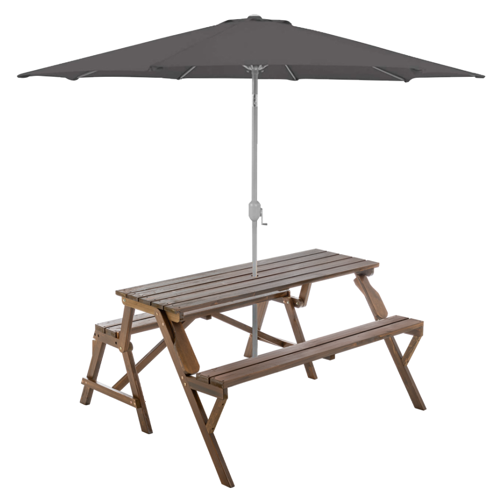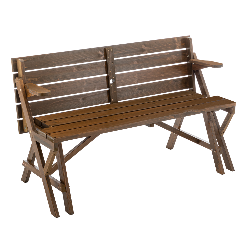 Tento zahradní kousek je vyroben z borového dřeva v hnědém barevném provedení, přičemž pro dlouhodobé zachování jeho kvality doporučujeme ochranu před nepříznivými povětrnostními podmínkami. Ve středu stolu se nachází otvor na slunečník, díky čemuž si můžete vytvořit příjemný stín během horkých dnů. Největší výhodou je však jeho multifunkčnost, snadno jej přeměníte ze stolu se sezením na pohodlnou lavičku. ZAGIR je ideální na zahradu, terasu či do altánku, kde oceníte jeho univerzálnost a chytré řešení pro úsporu místa.