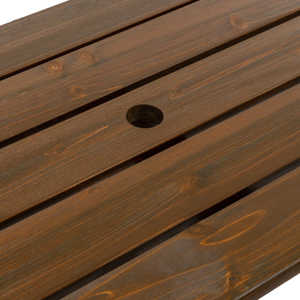 Materiál: borové dřevo Barva: hnědá Rozměry stůl s lavicemi (ŠxHxV): 139,5x133,5x73 cm Rozměry lavička (ŠxHxV): 139x61x83 cm Výška sedu: 47,2 cm Hloubka sedu: 38 cm Šířka sedu: 121,7 cm Výška zad: 37 cm S otvorem na slunečník Průměr otvoru na slunečník: 3,9 cm Odolný vůči povětrnostním podmínkám…