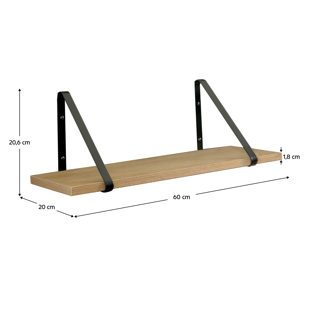 Materiál: MDF laminovaná/kov Tloušťka MDF: 1,8 cm Barva: dub/černá Rozměry (ŠxHxV): 60x20x1,8 cm Výška s držáky: 20,6 cm Nosnost: 10 kg Závěsná Úložný prostor Jednoduché a univerzální provedení Moderní design Doporučujeme připevnit ke zdi Dodáván v demontu