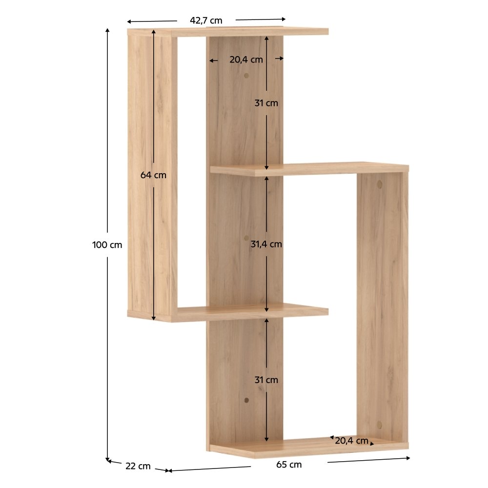 Materiál: laminovaná DTD Barva: dub craft zlatý Rozměry (ŠxHxV): 65x22x100 cm Tloušťka materiálu: 1,6 cm Hmotnost: 10 kg Nosnost police: 5 kg Nástěnná Závěsná Otevřený úložný prostor Moderní Doporučujeme připevnit ke stěně Kvalitní slovenský výrobek Dodáváno v demontu