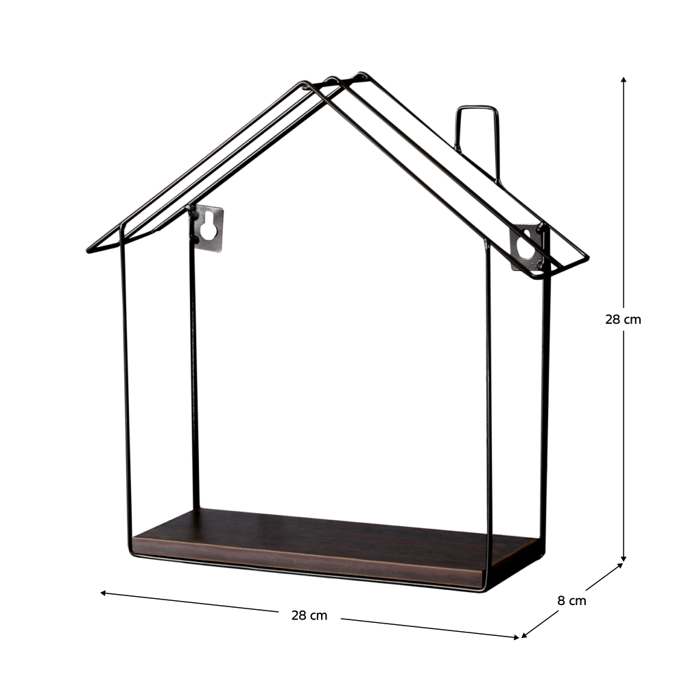Materiál: MDF laminovaná/kov Tloušťka MDF: 0,9 cm Barva: ořech/černá Rozměry (ŠxHxV): 28x8x28 cm Nosnost: 3 kg Závěsná Tvar domečku Úložný prostor Moderní design Doporučujeme připevnit ke zdi Dodáván v monte