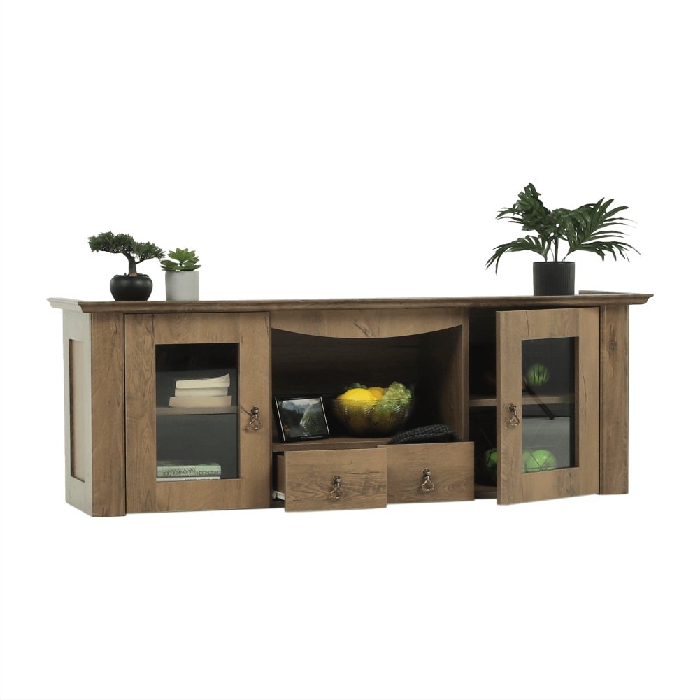 Materiál: DTD laminovaná / ABS hrany Barva: dub lefkas Rozměry (ŠxHxV): 165x42x106 cm Tloušťka materiálu: 30 mm dvě skříňky otevřené police čtyři šuplíky 3D efekt kovové úchytky ABS hrany barokní styl