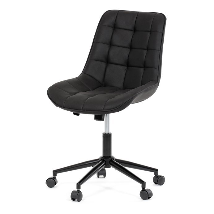 Kancelářská židle s černým potahem v dekoru broušené kůže nabízí moderní vzhled a komfortní sezení. Sedák i opěradlo jsou čalouněné kvalitní látkou, která je příjemná na dotek a snadno se udržuje. Pevný kovový kříž zajišťuje stabilitu a odolnost, zatímco houpací mechanika umožňuje plynulé naklápění pro uvolnění během práce. Výškově nastavitelná sedací plocha umožňuje přizpůsobení výšky podle individuálních potřeb uživatele. Absence područek a bederní opěrky podtrhuje minimalistický design vhodný do různých pracovních prostor.